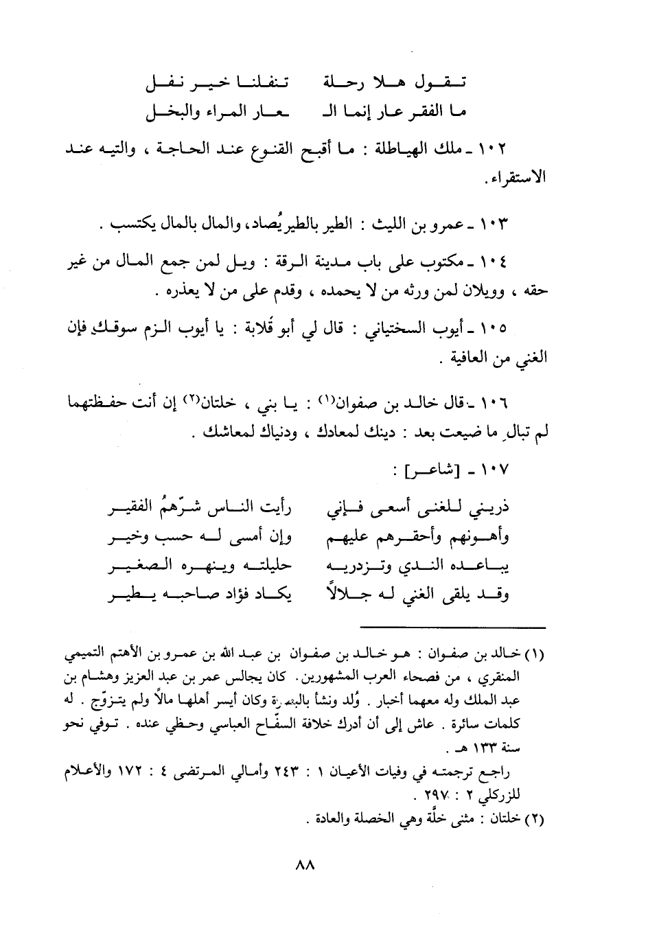 106- قال خالد بن صفوان «1» : يا بني، خلتان «2» إن أنت حفظتهما لم تبال ما ضيعت بعد: دينك لمعادك، ودنياك لمعاشك.