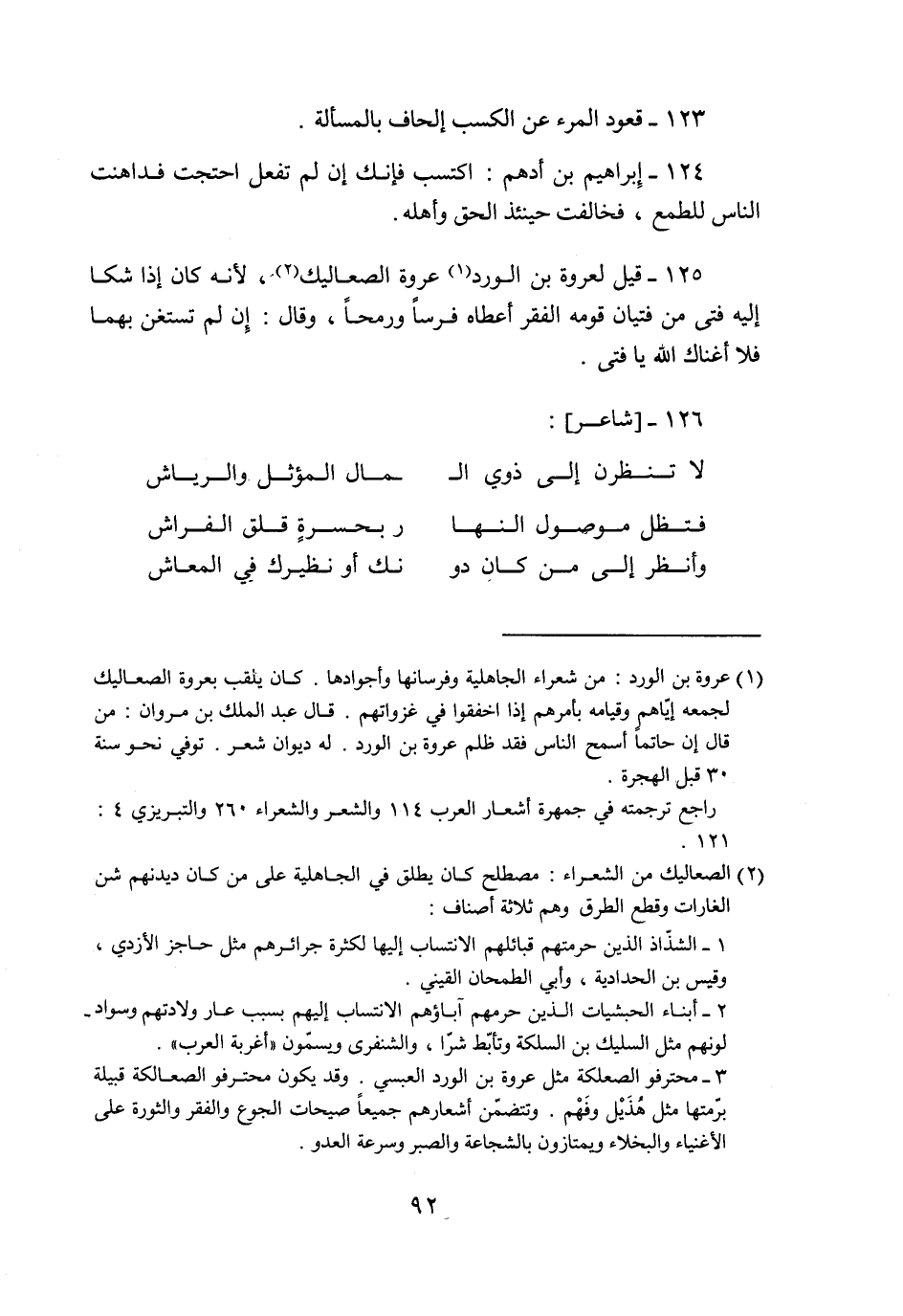 125- قيل لعروة بن الورد «1» عروة الصعاليك «2» ، لأنه كان إذا شكا إليه فتى من فتيان قومه الفقر أعطاه فرسا ورمحا، وقال: إن لم تستغن بهما فلا أغناك الله يا فتى.