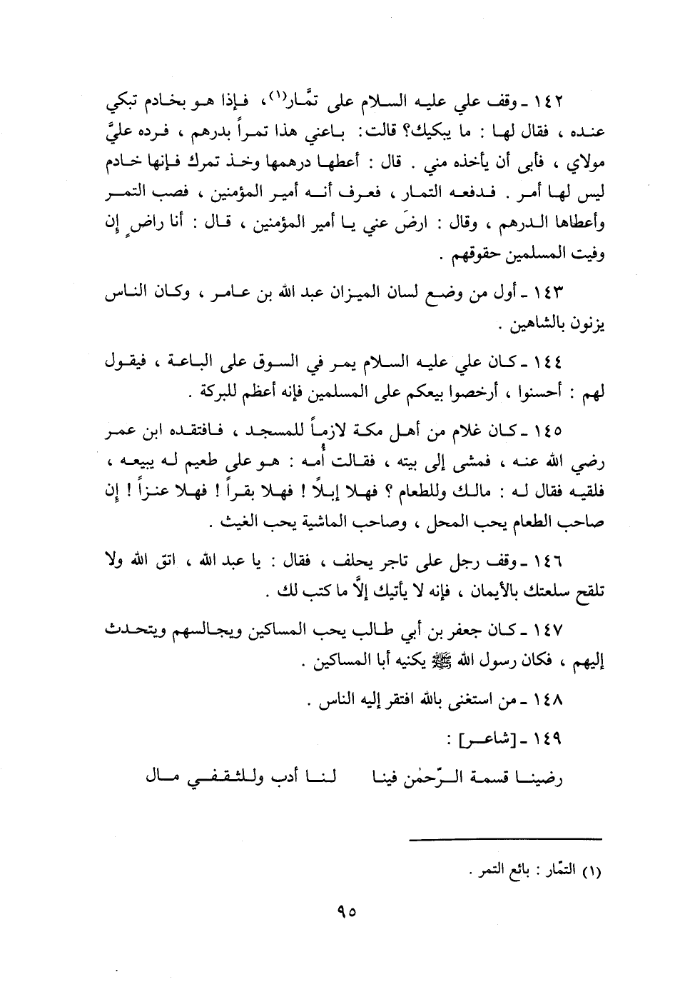 142- وقف علي عليه السلام على تمّار «1» ، فإذا هو بخادم تبكي عنده، فقال لها: ما يبكيك؟ قالت: باعني هذا تمرا بدرهم، فرده عليّ مولاي، فأبى أن يأخذه مني. قال: أعطها درهمها وخذ تمرك فإنها خادم ليس لها أمر. فدفعه التمار، فعرف أنه أمير المؤمنين، فصب التمر وأعطاها الدرهم، وقال: ارض عني يا أمير المؤمنين، قال: أنا راض إن وفيت المسلمين حقوقهم.
