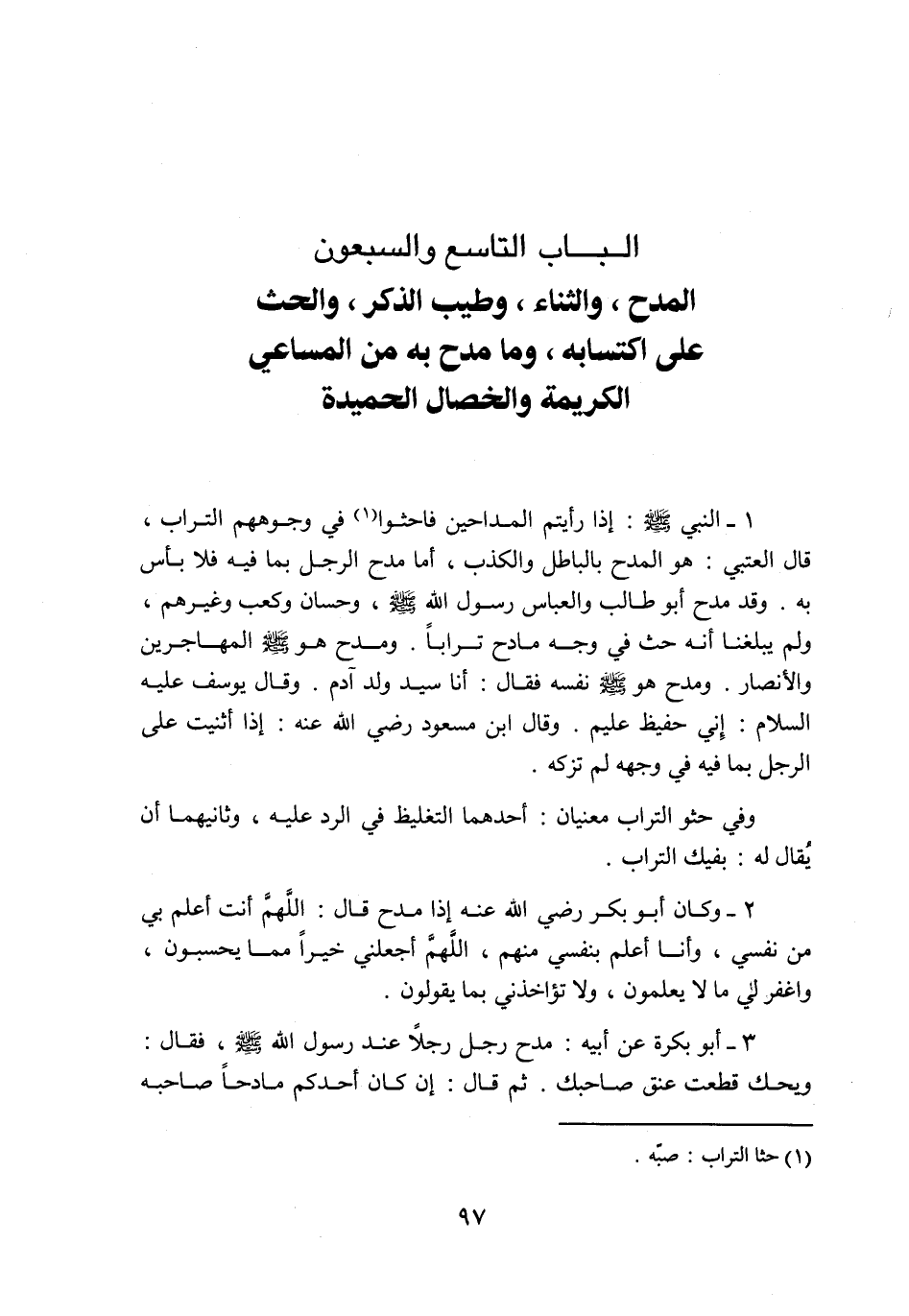 الباب التاسع والسبعون المدح، والثناء، وطيب الذكر، والحث على اكتسابه، وما مدح به من المساعي الكريمة والخصال الحميدة