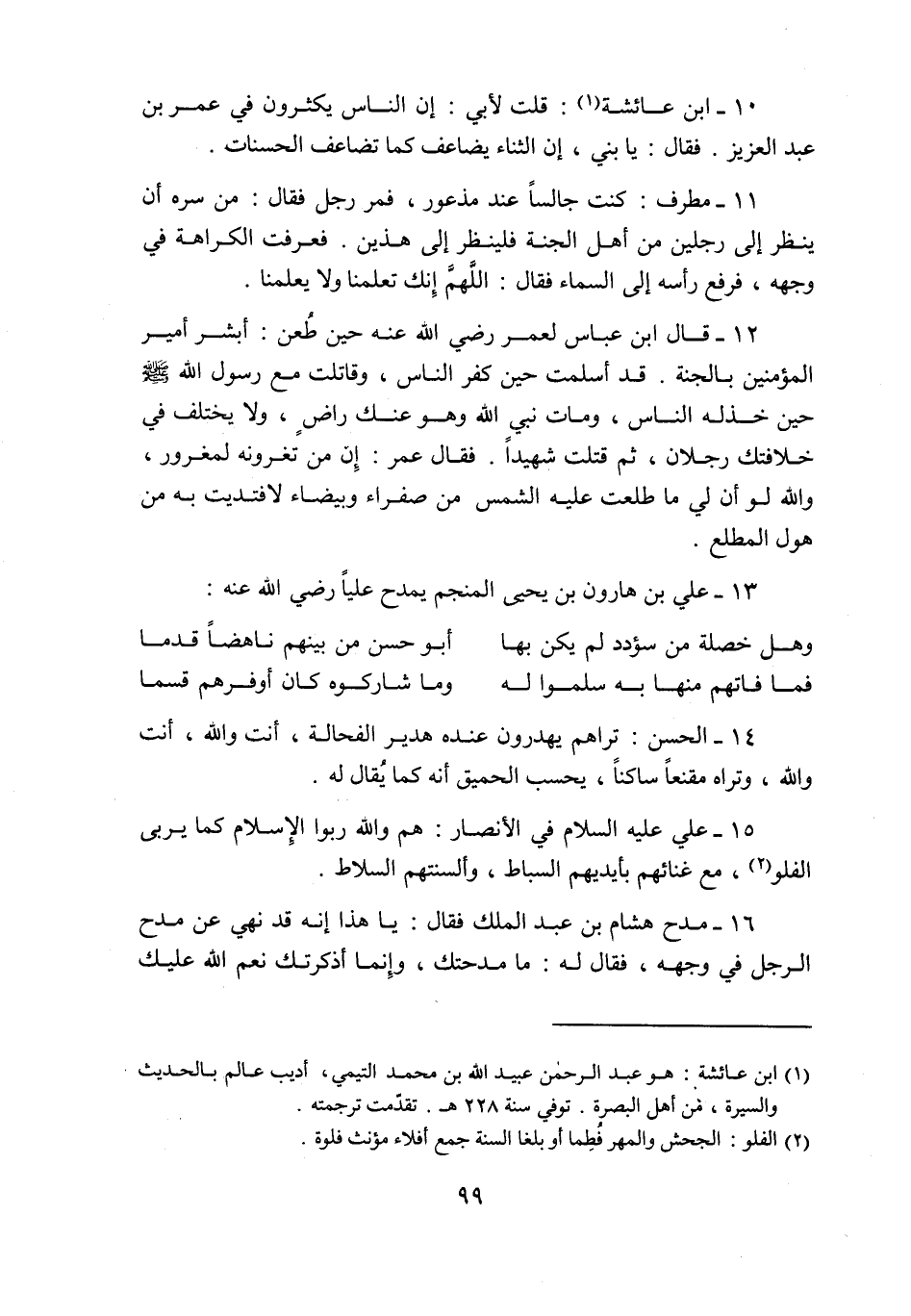 10- ابن عائشة «1» : قلت لأبي: إن الناس يكثرون في عمر بن عبد العزيز. فقال: يا بني، إن الثناء يضاعف كما تضاعف الحسنات.