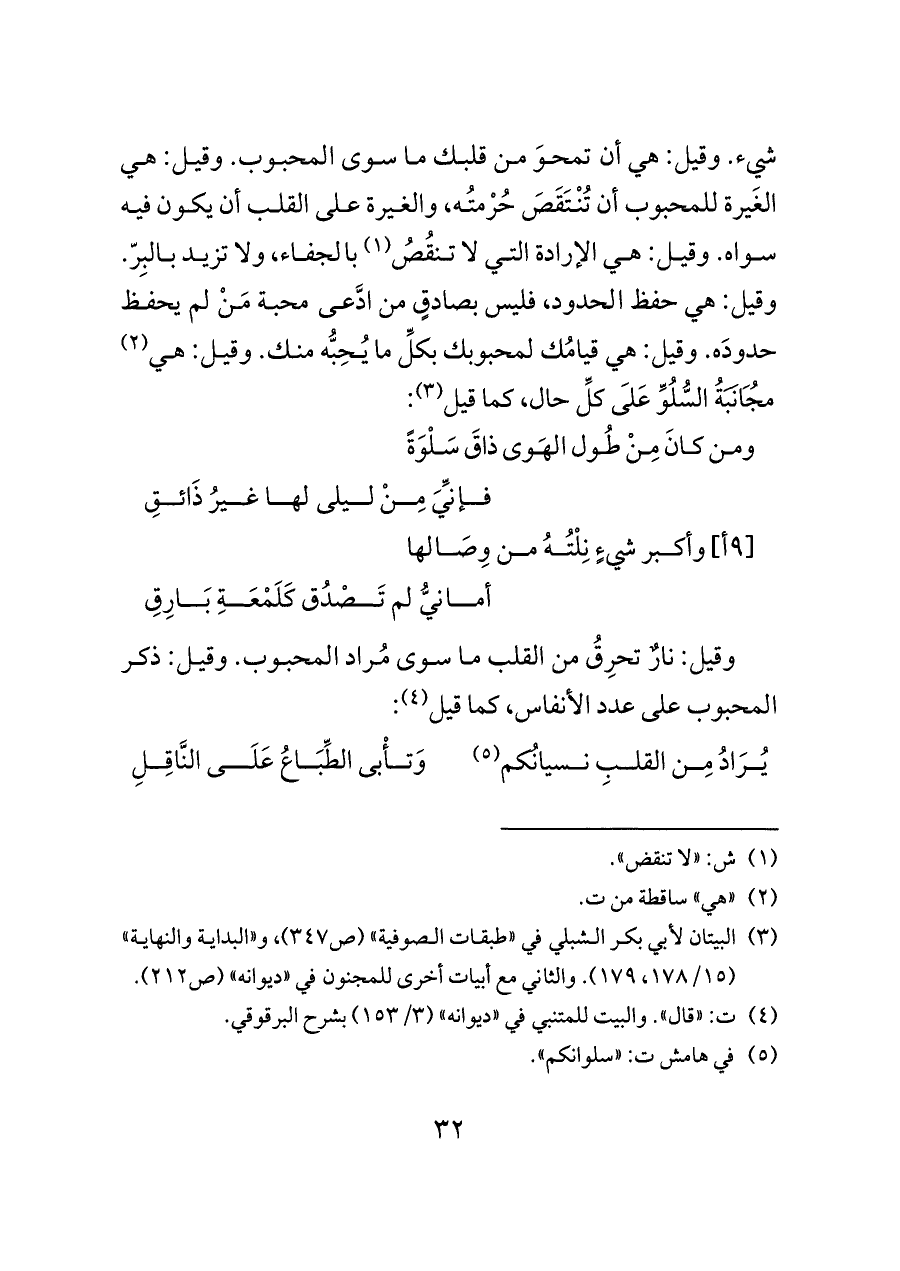 شيء. وقيل: هي أن تمحوَ من قلبك ما سوى المحبوب. وقيل: هي الغَيرة للمحبوب أن تُنْتَقَصَ حُرْمتُه، والغيرة على القلب أن يكون فيه سواه. وقيل: هي الإرادة التي لا تنقُصُ (¬١) بالجفاء، ولا تزيد بالبِرّ. وقيل: هي حفظ الحدود، فليس بصادقٍ من ادَّعى محبة مَنْ لم يحفظ حدودَه. وقيل: هي قيامُك لمحبوبك بكلِّ ما يُحِبُّه منك. وقيل: هي (¬٢) مُجَانَبَةُ السُّلُوِّ عَلَى كلِّ حال، كما قيل (¬٣):