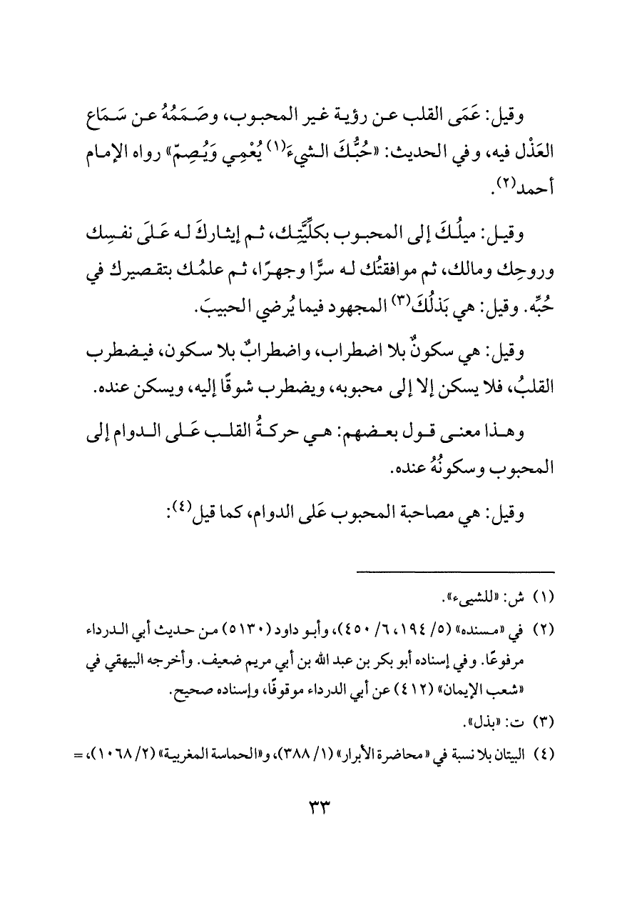وقيل: ميلُكَ إلى المحبوب بكلِّيَّتِك، ثم إيثاركَ له عَلَى نفسِك وروحِك ومالك، ثم موافقتُك له سرًّا وجهرًا، ثم علمُك بتقصيرك في حُبِّه. وقيل: هي بَذلُكَ (¬٣) المجهود فيما يُرضي الحبيبَ.