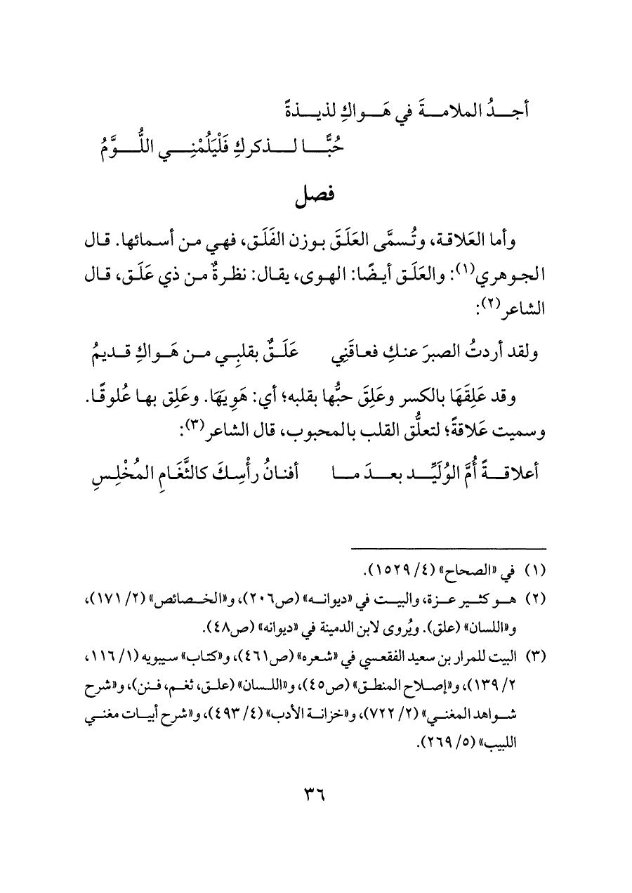 وأما العَلاقة، وتُسمَّى العَلَقَ بوزن الفَلَق، فهي من أسمائها. قال الجوهري (¬١): والعَلَق أيضًا: الهوى، يقال: نظرةٌ من ذي عَلَق، قال الشاعر (¬٢):