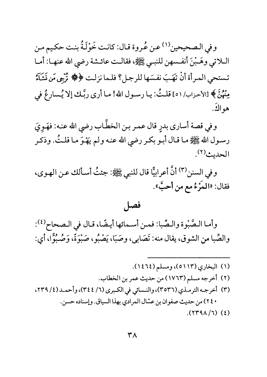 وفي السنن (¬٣) أنَّ أعرابيًّا قال للنبي - صلى الله عليه وسلم -: جئتُ أسألك عن الهوى، فقال: «المَرْءُ مع من أحبَّ».