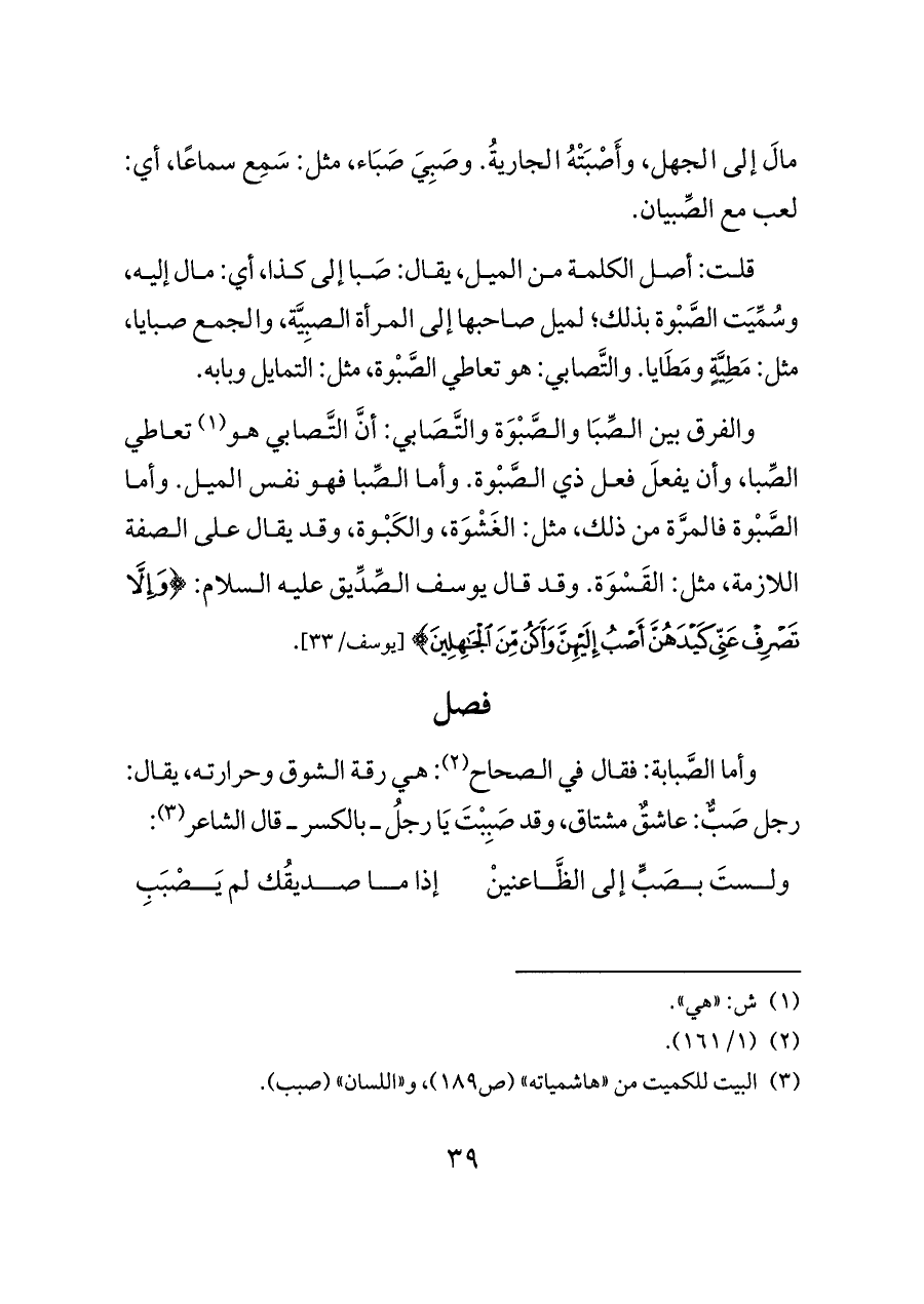 والفرق بين الصِّبَا والصَّبْوَة والتَّصَابي: أنَّ التَّصابي هو (¬١) تعاطي الصِّبا، وأن يفعلَ فعل ذي الصَّبْوة. وأما الصِّبا فهو نفس الميل. وأما الصَّبْوة فالمرَّة من ذلك، مثل: الغَشْوَة، والكَبْوة، وقد يقال على الصفة اللازمة، مثل: القَسْوَة. وقد قال يوسف الصِّدِّيق عليه السلام: {وَإِلَّا تَصْرِفْ عَنِّي كَيْدَهُنَّ أَصْبُ إِلَيْهِنَّ وَأَكُنْ مِنَ الْجَاهِلِينَ} [يوسف/٣٣].