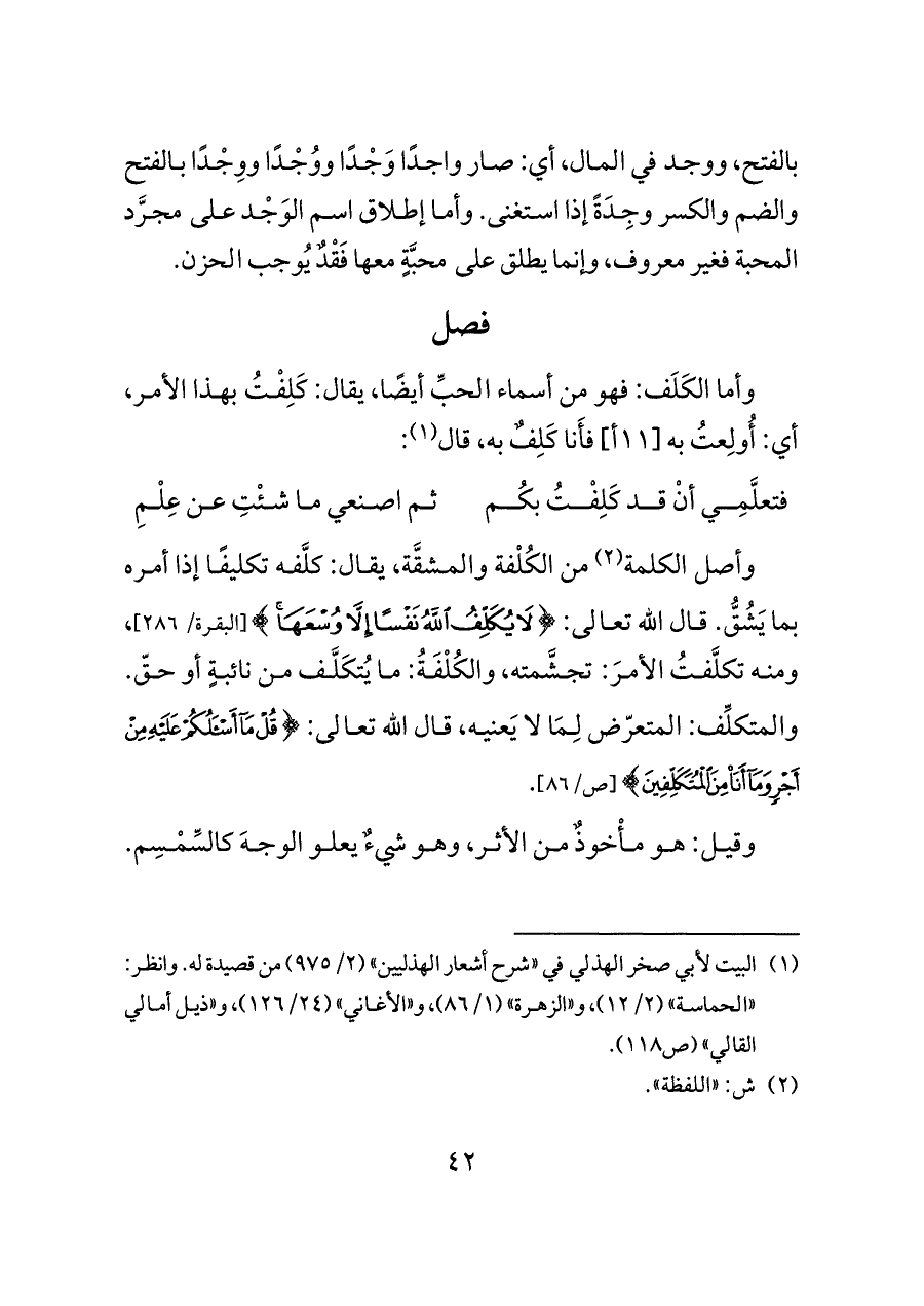 وأصل الكلمة (¬٢) من الكُلْفة والمشقَّة، يقال: كلَّفه تكليفًا إذا أمره بما يَشُقُّ. قال الله تعالى: {لَا يُكَلِّفُ اللَّهُ نَفْسًا إِلَّا وُسْعَهَا} [البقرة/ ٢٨٦]، ومنه تكلَّفتُ الأمرَ: تجشَّمته، والكُلْفَةُ: ما يُتكَلَّف من نائبةٍ أو حقّ. والمتكلِّف: المتعرّض لِمَا لا يَعنيه، قال الله تعالى: {قُلْ مَا أَسْأَلُكُمْ عَلَيْهِ مِنْ أَجْرٍ وَمَا أَنَا مِنَ الْمُتَكَلِّفِينَ} [ص/٨٦].