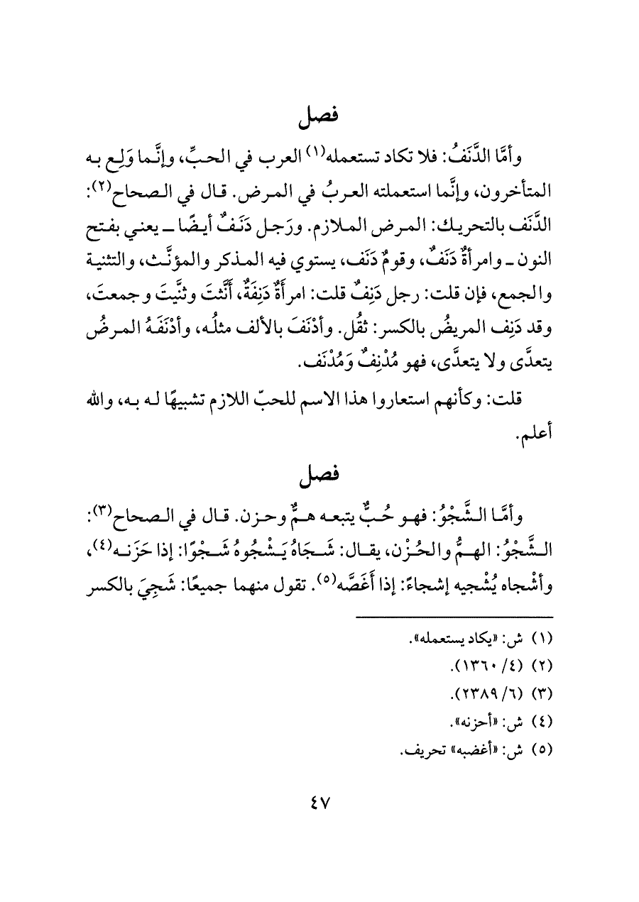وأمَّا الدَّنَفُ: فلا تكاد تستعمله (¬١) العرب في الحبِّ، وإنَّما وَلِع به المتأخرون، وإنَّما استعملته العربُ في المرض. قال في الصحاح (¬٢): الدَّنَف بالتحريك: المرض الملازم. ورَجل دَنَفٌ أيضًا ــ يعني بفتح النون ــ وامرأةٌ دَنَفٌ، وقومٌ دَنَف، يستوي فيه المذكر والمؤنَّث، والتثنية والجمع، فإن قلت: رجل دَنِفٌ قلت: امرأَةٌ دَنِفَةٌ، أَنَّثتَ وثنَّيتَ وجمعتَ، وقد دَنِف المريضُ بالكسر: ثقُل. وأدْنَفَ بالألف مثلُه، وأدْنَفَهُ المرضُ يتعدَّى ولا يتعدَّى، فهو مُدْنِفٌ وَمُدْنَف.