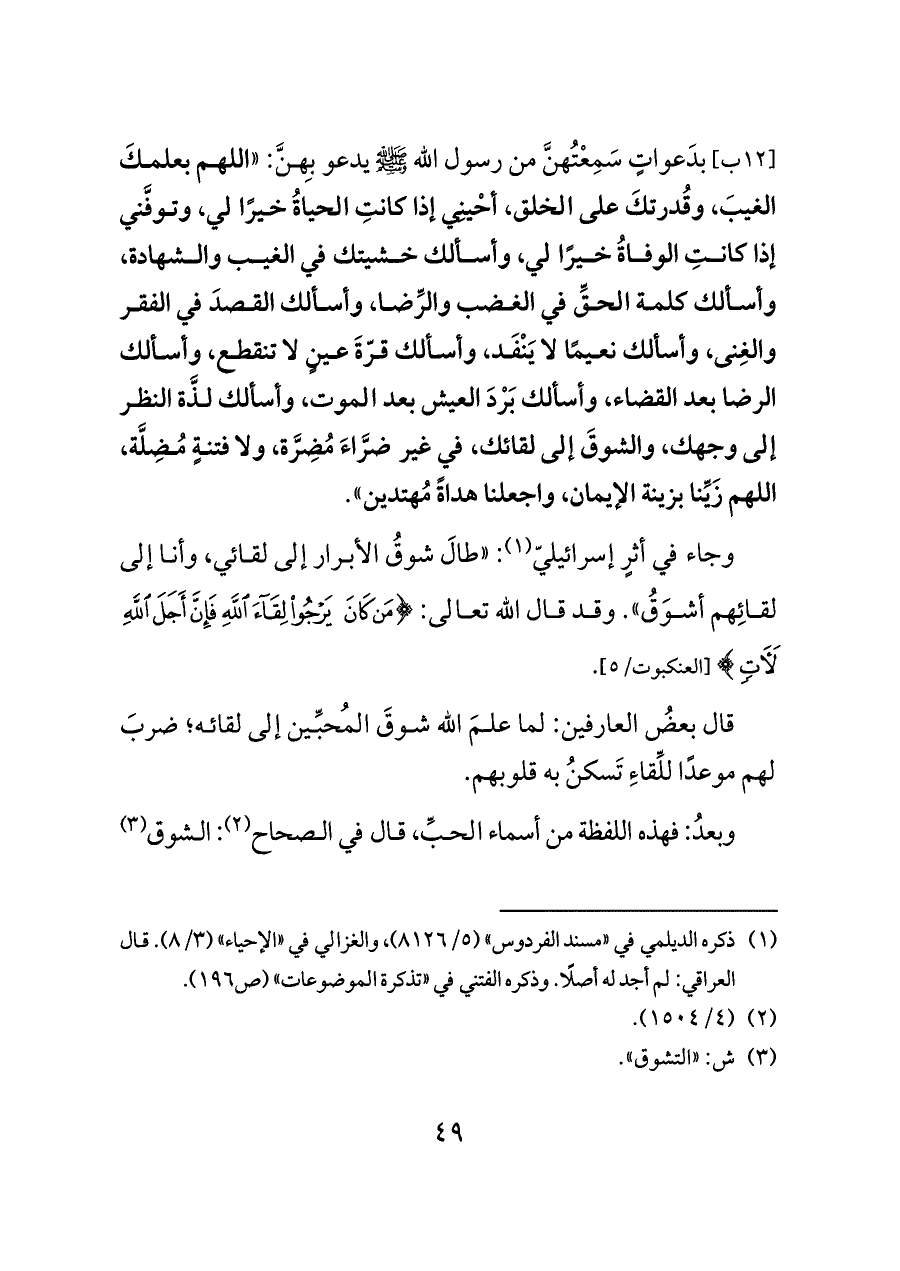 [١٢ ب] بدَعواتٍ سَمِعْتُهنَّ من رسول الله - صلى الله عليه وسلم - يدعو بِهنَّ: «اللهم بعلمكَ الغيبَ، وقُدرتكَ على الخلق، أحْينِي إذا كانتِ الحياةُ خيرًا لي، وتوفَّني إذا كانتِ الوفاةُ خيرًا لي، وأسألك خشيتك في الغيب والشهادة، وأسألك كلمة الحقِّ في الغضب والرِّضا، وأسألك القصدَ في الفقر والغِنى، وأسألك نعيمًا لا يَنْفَد، وأسألك قرّةَ عينٍ لا تنقطع، وأسألك الرضا بعد القضاء، وأسألك بَرْدَ العيش بعد الموت، وأسألك لذَّة النظر إلى وجهك، والشوقَ إلى لقائك، في غير ضرَّاءَ مُضِرَّة، ولا فتنةٍ مُضِلَّة، اللهم زَيِّنا بزينة الإيمان، واجعلنا هداةً مُهتدين».