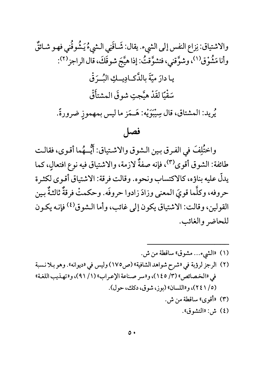 والاشتياق: نِزاع النفس إلى الشيء. يقال: شَاقَنِي الشيءُ يَشُوقُني فهو شائقٌ وأنا مَشُوْق (¬١)، وشوَّقني، فتشوَّقتُ: إذا هيَّجَ شوقَكَ، قال الراجز (¬٢):