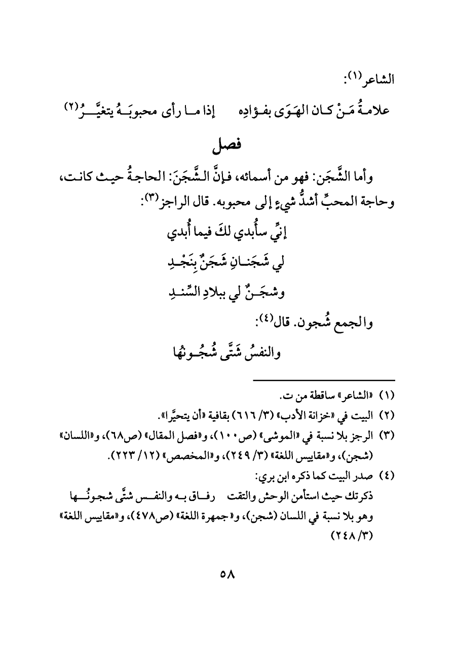 (¬٣) الرجز بلا نسبة في «الموشى» (ص ١٠٠)، و «فصل المقال» (ص ٦٨)، و «اللسان» (شجن)، و «مقاييس اللغة» (٣/ ٢٤٩)، و «المخصص» (١٢/ ٢٢٣).