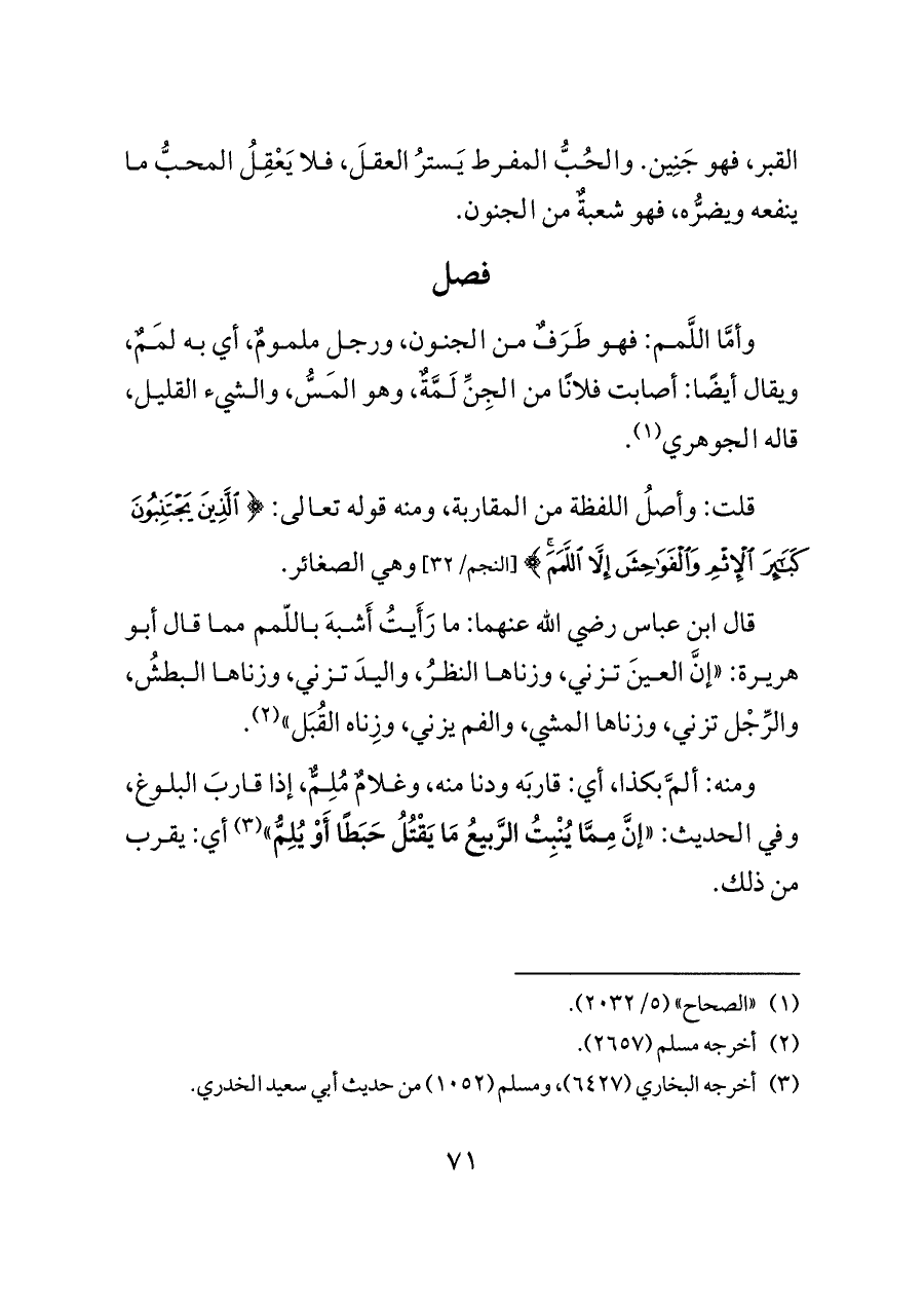 قال ابن عباس رضي الله عنهما: ما رَأَيتُ أَشبهَ باللّمم مما قال أبو هريرة: «إنَّ العينَ تزني، وزناها النظرُ، واليدَ تزني، وزناها البطشُ، والرِّجْل تزني، وزناها المشي، والفم يزني، وزِناه القُبَل» (¬٢).