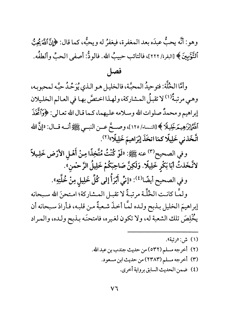 وأمَّا الخُلَّة: فتوحيدُ المحبَّة، فالخليل هو الذي يُوَحِّدُ حبَّه لمحبوبه، وهي مرتبةٌ (¬١) لا تقبلُ المشاركة، ولهذا اختصَّ بها في العالم الخليلان إبراهيم ومحمدٌ صلوات الله وسلامه عليهما، كما قال الله تعالى: {وَاتَّخَذَ اللَّهُ إِبْرَاهِيمَ خَلِيلًا} [النساء/١٢٥]، وصحَّ عن النبي - صلى الله عليه وسلم -أنه قال: «إنَّ الله اتَّخَذني خَلِيلًا كمَا اتخَذَ إبْرَاهيمَ خَلِيلًا» (¬٢).