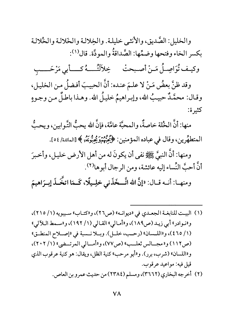منها: أنَّ الخُلة خاصةٌ، والمحبَّة عامَّة، فإنَّ الله يحبُّ التَّوابين، ويحبُّ المتطهِّرين، وقال في عباده المؤمنين: {يُحِبُّهُمْ وَيُحِبُّونَهُ} [المائدة/٥٤].