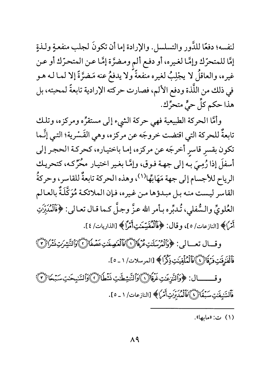 وأمَّا الحركة الطبيعية فهي حركة الشيء إلى مستقرِّه ومركزه، وتلك تابعةٌ للحركة التي اقتضت خروجَه عن مركزه، وهي القَسْرية؛ التي إنَّما تكون بقسرِ قاسرٍ أخرجَه عن مركزه، إما باختياره، كحركة الحجر إلى أسفلَ إذا رُمِيَ به إلى جهة فوق، وإمَّا بغير اختيار مُحَرِّكه، كتحريك الرياح للأجسام إلى جهة مَهَابِّها (¬١)، وهذه الحركة تابعةٌ للقاسر، وحركةُ القاسر ليست منه بل مبدؤها من غيره، فإن الملائكة مُوَكَّلَةٌ بالعالم العُلويِّ والسُّفلي، تُدبِّره بأمر الله عزَّ وجلَّ كما قال تعالى: {فَالْمُدَبِّرَاتِ أَمْرًا} [النازعات/٥]، وقال: {فَالْمُقَسِّمَاتِ أَمْرًا} [الذاريات/٤].