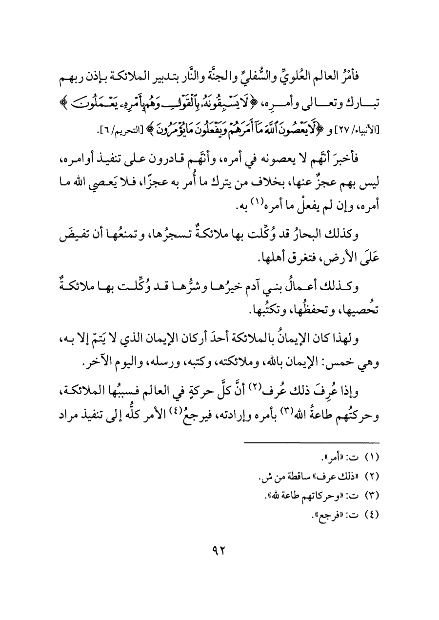 ولهذا كان الإيمانُ بالملائكة أحدَ أركان الإيمان الذي لا يَتمّ إلا به، وهي خمس: الإيمان بالله، وملائكته، وكتبه، ورسله، واليوم الآخر.