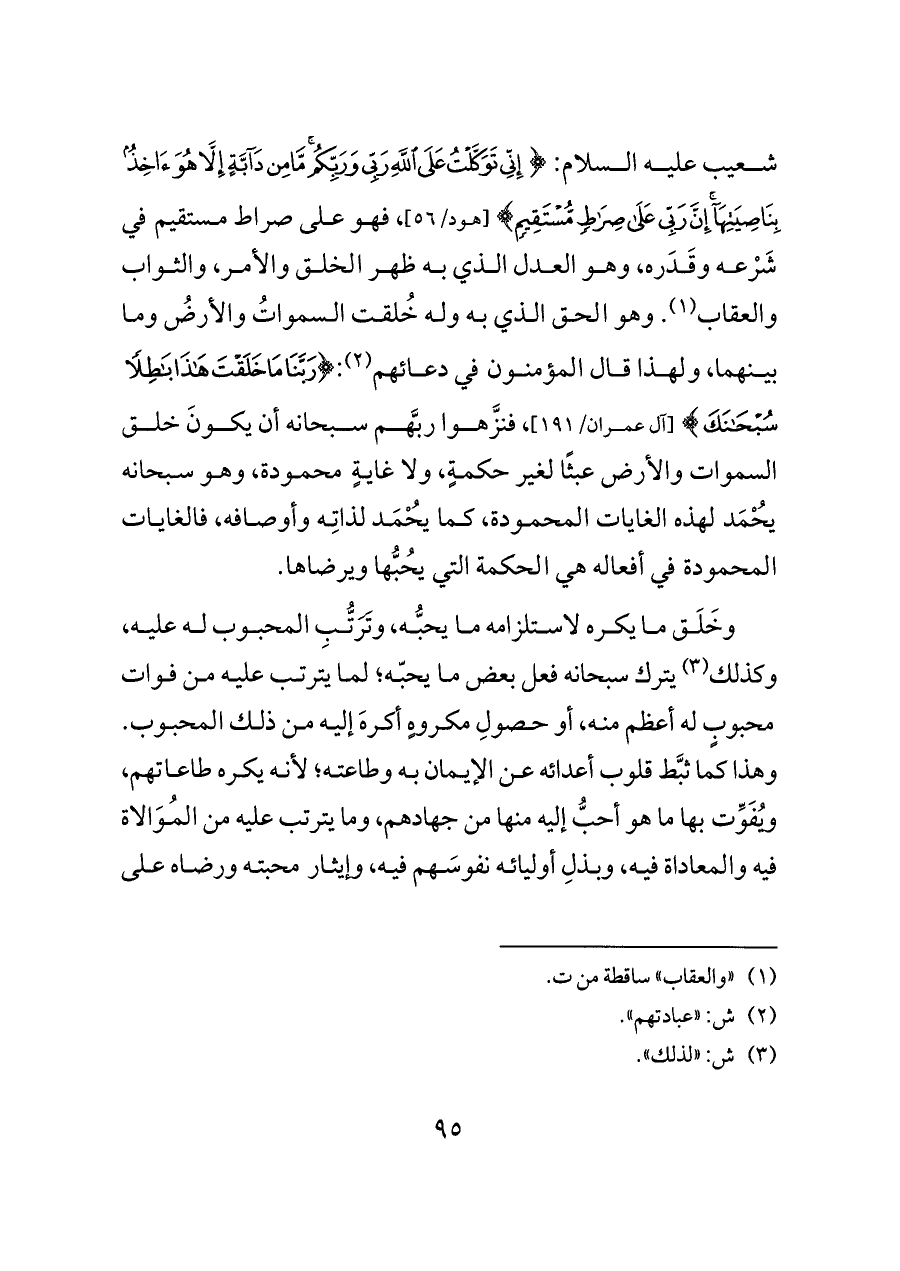 شعيب عليه السلام: {إِنِّي تَوَكَّلْتُ عَلَى اللَّهِ رَبِّي وَرَبِّكُمْ مَا مِنْ دَابَّةٍ إِلَّا هُوَ آخِذٌ بِنَاصِيَتِهَا إِنَّ رَبِّي عَلَى صِرَاطٍ مُسْتَقِيمٍ} [هود/٥٦]، فهو على صراط مستقيم في شَرْعه وقَدَره، وهو العدل الذي به ظهر الخلق والأمر، والثواب والعقاب (¬١). وهو الحق الذي به وله خُلقت السمواتُ والأرضُ وما بينهما، ولهذا قال المؤمنون في دعائهم (¬٢): {رَبَّنَا مَا خَلَقْتَ هَذَا بَاطِلًا سُبْحَانَكَ} [آل عمران/١٩١]، فنزَّهوا ربَّهم سبحانه أن يكونَ خلق السموات والأرض عبثًا لغير حكمةٍ، ولا غايةٍ محمودة، وهو سبحانه يُحْمَد لهذه الغايات المحمودة، كما يُحْمَد لذاتِه وأوصافه، فالغايات المحمودة في أفعاله هي الحكمة التي يُحبُّها ويرضاها.