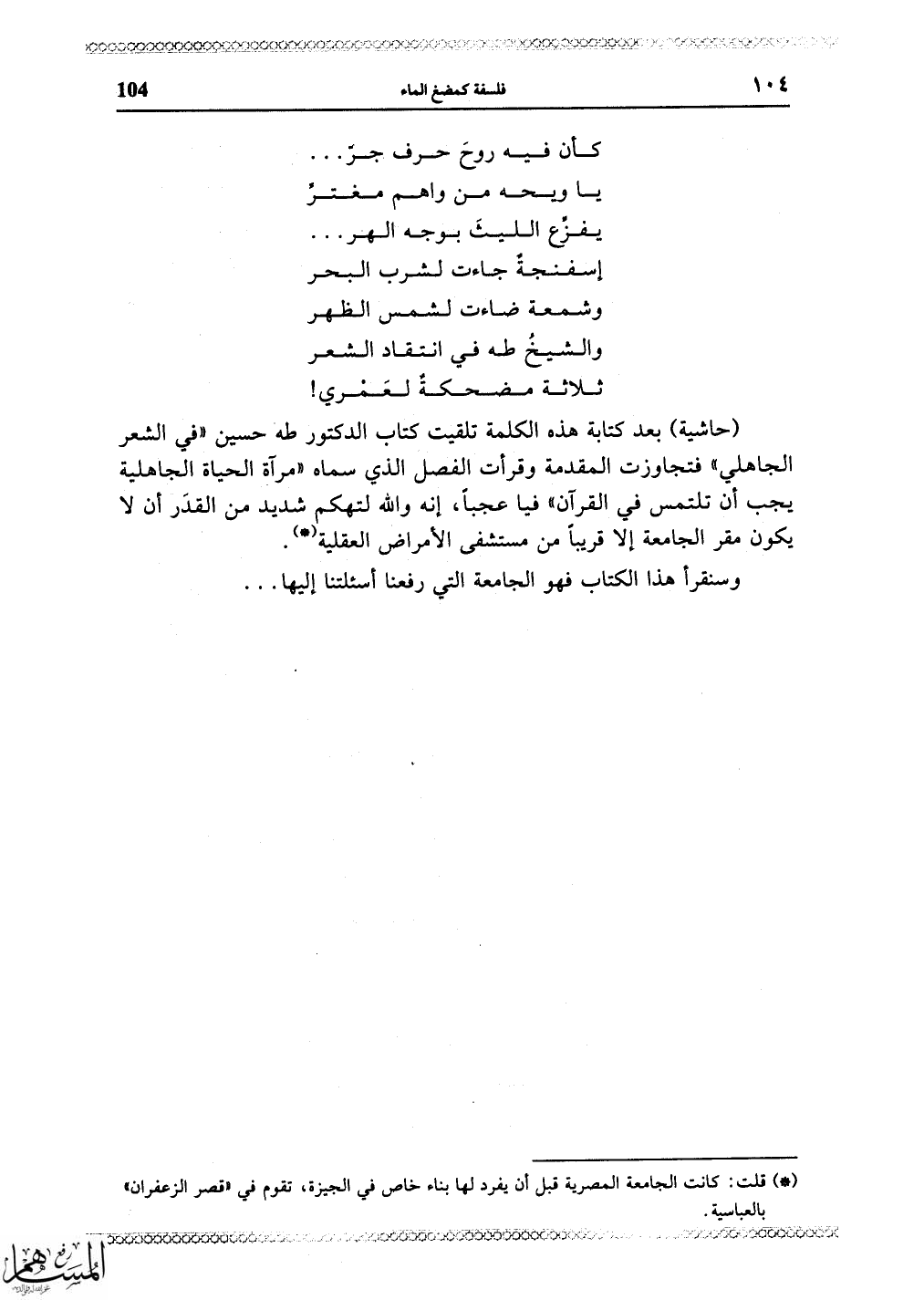 "في الشعر الجاهلي" فتجاوزت المقدمة وقرأت الفصل الذي سماه "مرآة الحياة الجاهلية يجب أن تلتمس في القرآن" فيا عجباً، إنه والله لتهكم شديد من القدَر أن لا يكون مقر الجامعة إلا قريباً من مستشفى الأمراض العقلية.