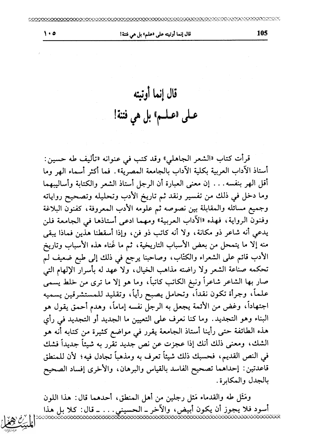 يدعي أنه شاعر ذو مكانة، ولا أنه كاتب ذو فن، واذا أسقطنا هذين فماذا يبقى منه إلا ما يتمحل من بعض الأسباب التاريخية، ثم ما غَناء هذه الأسباب وتاريخ الأدب قائم على الشعراء والكتاب، وصاحبنا يرجع في ذلك إلى طبع ضعيف لم تحكمه صناعة الشعر ولا راضته مذاهب الخيال، ولا عهد له بأسرار الإلهام التي صار بها الشاعر شاعراً ونبغ الكاتب كاتباً، وما هو إلا ما ترى من خلط يسمى علماً، وجرأة تكون نقداً، وتحامل يصبح رأياً، وتقليد للمستشرقين يسميه اجتهاداً، وغض من الأئمة يجعل به الرجل نفسه إماماً، وهدم أحمق يقول هو البناء وهو التجديد.