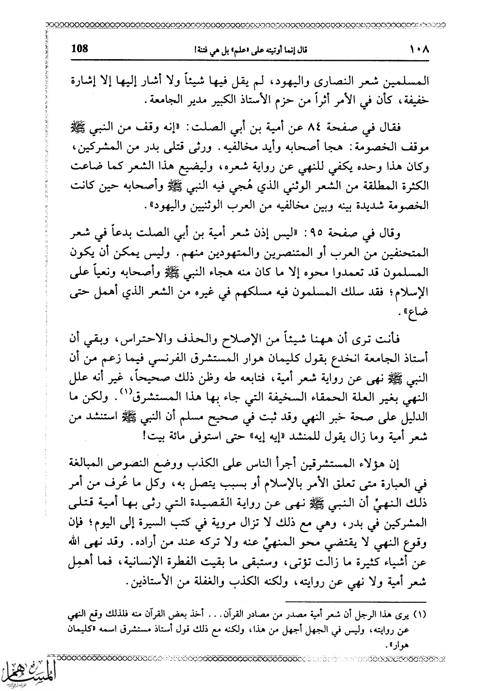 (1) يرى هذا الرجل أن شعر أمية مصدر من مصادر القرآن. . . أخذ بعض القرآن منه فلذلك وقع النص عن روايته، وليس في الجهل أجهل من هذا، ولكنه مع ذلك قول أستاذ مستشرق اسمه (كليمان هواراً) .