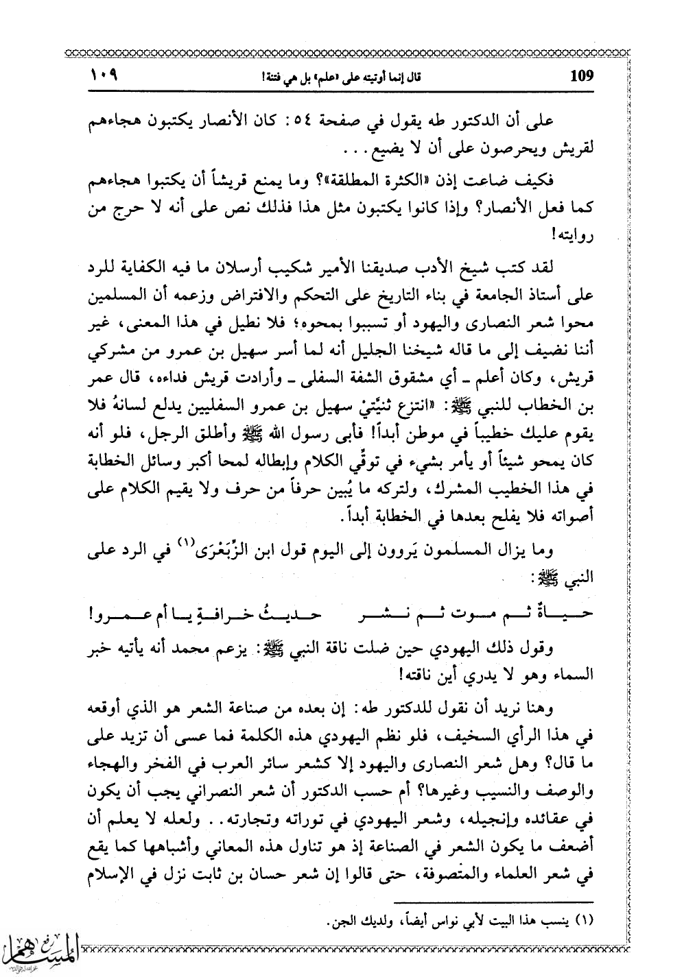 على أستاذ الجامعة في بناء التاريخ على التحكم والافتراض وزعمه أن المسلمين محوا شعر النصارى واليهود أوتسببوا بمحوه؛ فلا نطيل في هذا المعنى، غير أننا نضيف إلى ما قاله شيخنا الجليل أنه لما أسر سهيل بن عمرو من مشركي قريش، وكان أعلم - أي مشقوق الشفة السفلى - وأرادت قريش فداءه، قال عمر بن الخطاب للنبي - صلى الله عليه وسلم -: "انتزع ثنيتي سهيل بن عمرو السفليين يدلع لسانهُ فلا يقوم عليك خطيباً في موطن أبدا! فأبى رسول الله - صلى الله عليه وسلم - وأطلق الرجل، فلو أنه