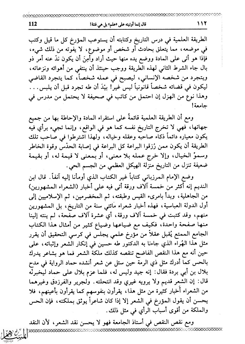 الطريقة العلمية في درس التاريخ وكتابته أن يستوعب المؤرخ كل ما قيل وكتب في موضعه، مما يتعلق بحادث أو شخص أو موضوع، لا يفوته من ذلك شيء، فإذا هو أتى على المادة ووضع يده منها حيث أراد وأمِنَ أن يكون ندَّ عنه أمر ذو بال جاء الشرط الثاني لهذه الطريقة ووجب حينئذ أن ينتفي من أهوائه ونزعاته، ويتجرد من شخصه الإنساني، ليصبح في عمله شخصاً، كما يتجرد القاضي ليكون في قضائه شخصاً قانونياً ليس غير! بيدَ أن طه تجرد قبل أن يلبس. . .