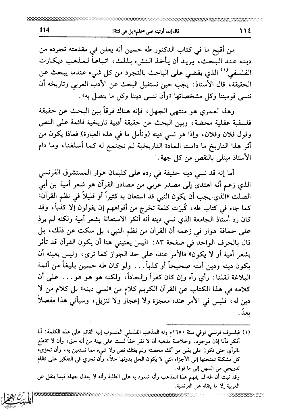 أما إنه قد نسي دينه حقيقة في رده على كليمان هوار المستشرق الفرنسي
