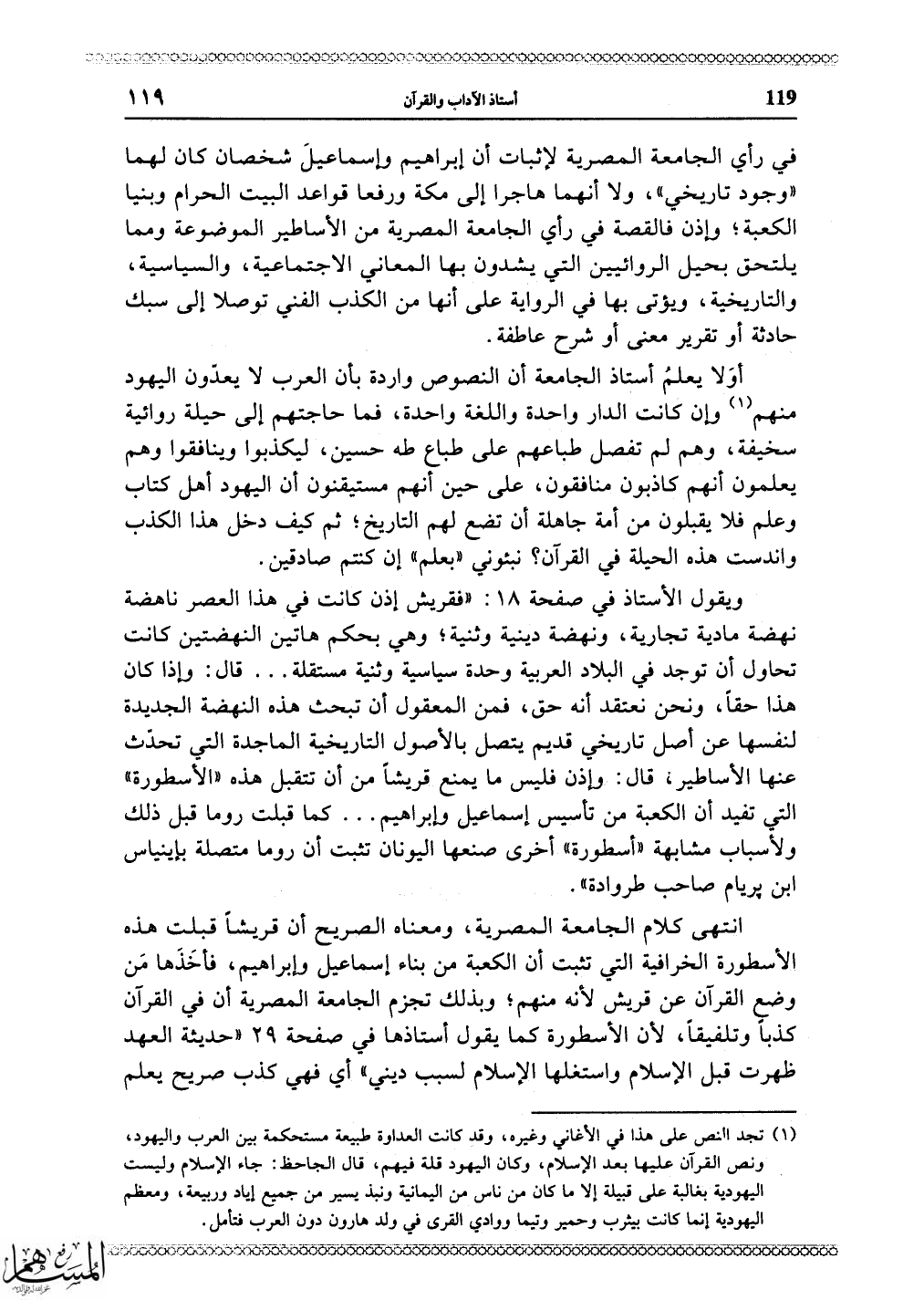 الأسطورة الخرافية التي تثبت أن الكعبة من بناء إسماعيل وإبراهيم، فأخَذَها مَن وضع القرآن عن قريش لأنه منهم؛ وبذلك تجزم الجامعة المصرية أن في القرآن كذباً وتلفيقاً، لأن الأسطورة كما يقول أستاذها في صفحة 29 حديثة العهد ظهرت قبل الإسلام واستغلها الإسلام لسبب ديني" أي فهي كذب صريح يعلم