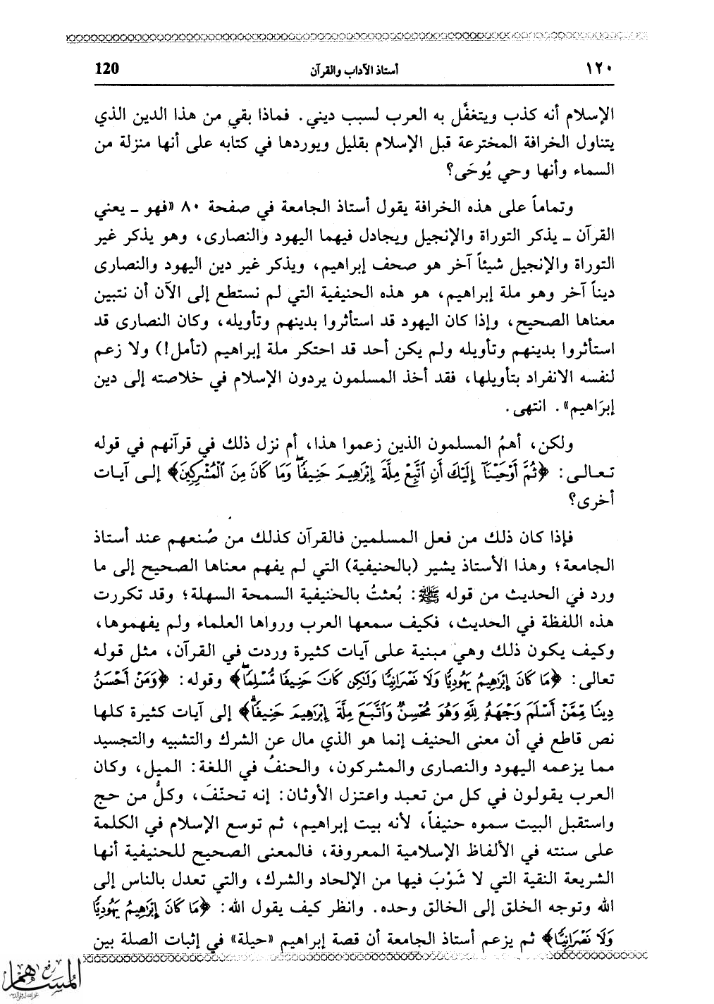 الجامعة؛ وهذا الأستاذ يشير (بالحنيفية) التي لم يفهم معناها الصحيح إلى ما