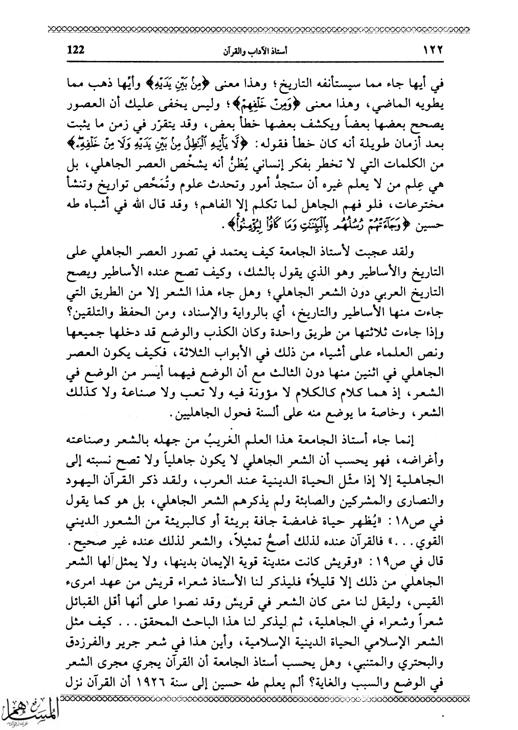 والبحتري والمتنبي، وهل يحسب أستاذ الجامعة أن القرآن يجري مجرى الشعر
