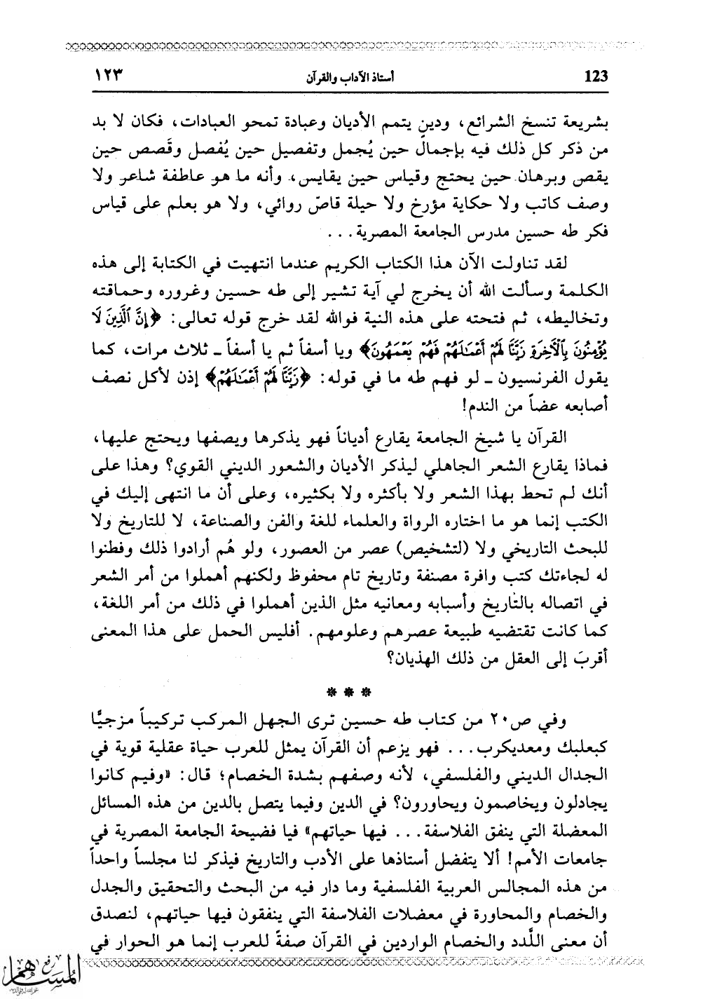 بشريعة تنسخ الشرائع، ودينِ يتمم الأديان وعبادة تمحو العبادات، فكان لا بد من ذكر كل ذلك فيه بإجمال حين يُجمل وتفصيل حين يُفصل وقَصص حين يقصى وبرهان - حين يحتج وقياس حين يقايس، - وأنه ما هو عاطفة شاعر ولا وصف كاتب ولا حكاية مؤرخ ولا حيلة قاصٍّ روائي، ولا هو بعلم على قياس فكر طه حسين مدرس الجامعة المصرية. . .