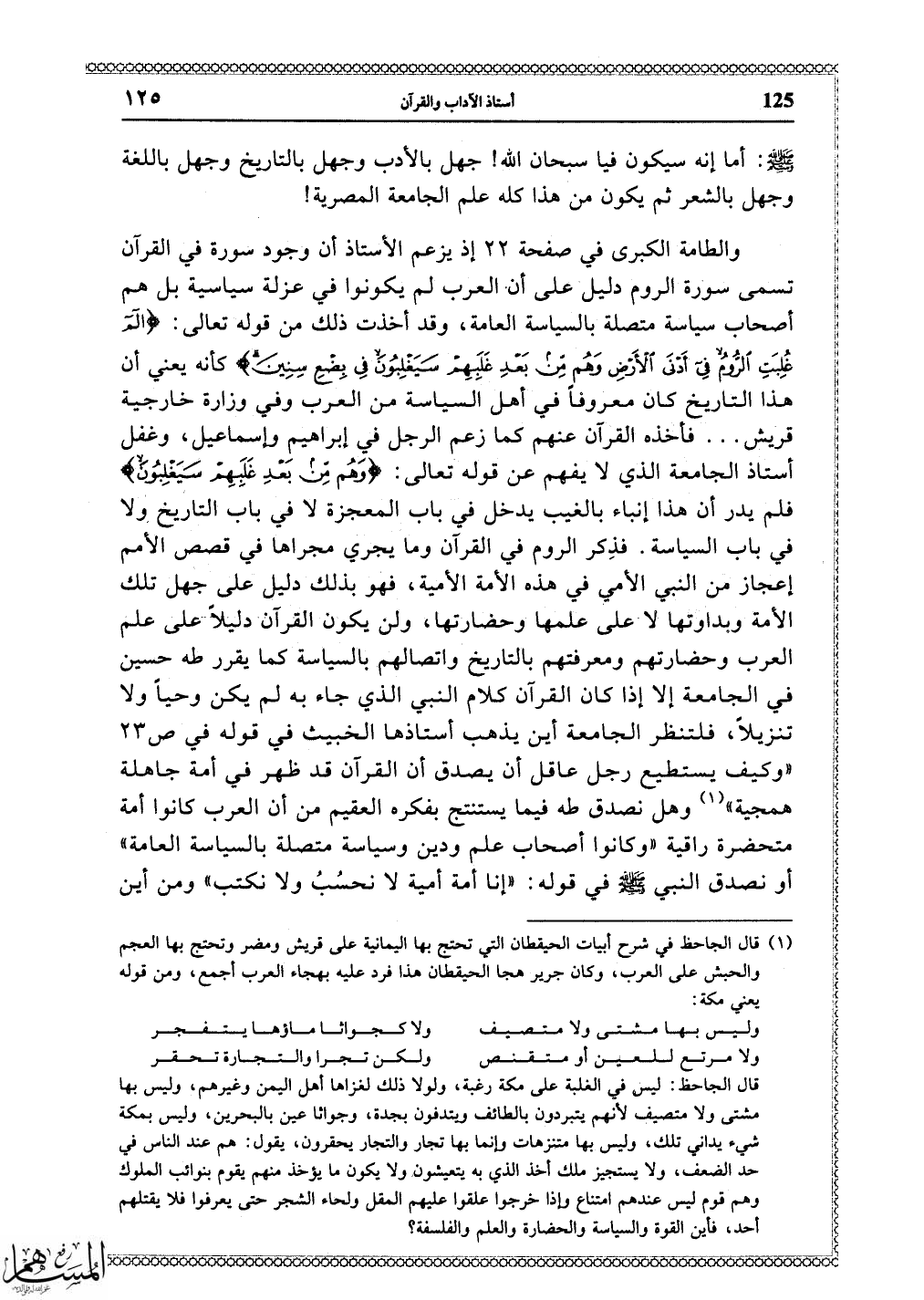 الأمة وبدأوتها لا - على علمها وحضارتها، ولن يكون القرآن - دليلاً - على علم العرب وحضارتهم ومعرفتهم بالتاريخ واتصالهم بالسياسة كما يقرر طه حسين في الجامعة إلا إذا كان القرآن كلام النبي الذي جاء به لم يكن وحياً ولا تنزيلاً، فلتنظر الجامعة أين يذهب أستاذها الخبيث في قوله في ص 23