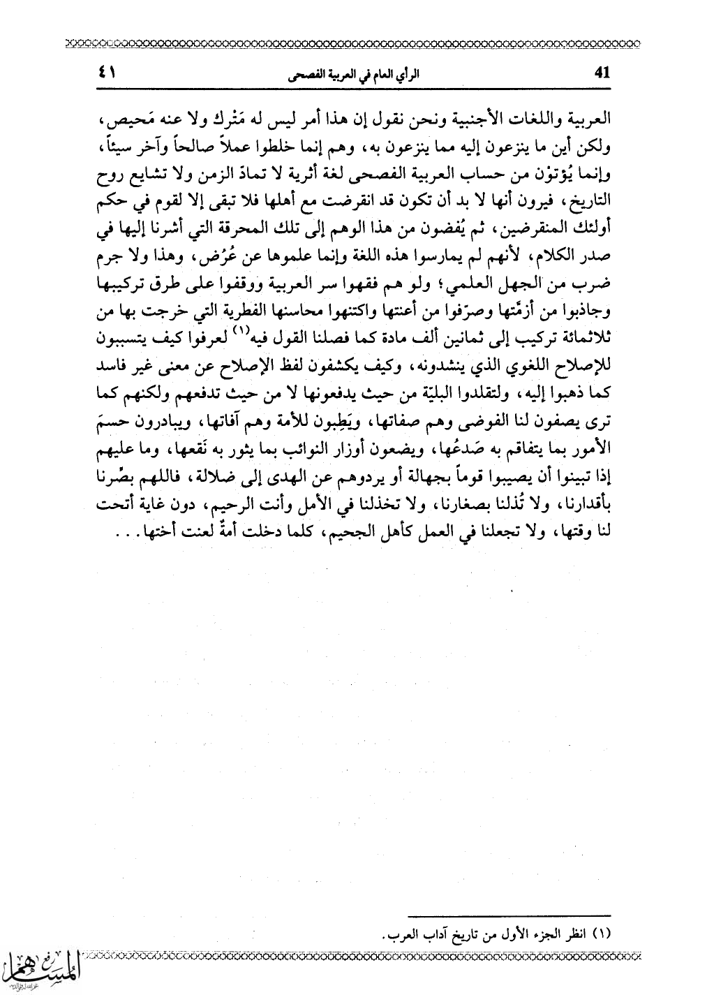 ثلاثمائة تركيب إلى ثمانين ألف مادة كما فصلنا القول فيه لعرفوا كيف يتسببون للإصلاح اللغوي الذي ينشدونه، وكيف يكشفون لفظ الإصلاح عن معنى غير فاسد كما ذهبوا إليه، ولتقلدوا البلية من حيث يدفعونها لا من حيث تدفعهم ولكنهم كما ترى يصفون لنا الفوضى وهم صفاتها، وَيطِبون للأمة وهم آفاتها، ويبادرون حسمَ الأمور بما يتفاقم به صَدعُها، ويضعون أوزار النوائب بما يثور به نَقعها، وما عليهم إذا تبينوا أن يصيبوا قوماً بجهالة أو يردوهم عن الهدى إلى ضلالة، فاللهم بصِّرنا بأقدارنا، ولا تُذلنا بصغارنا، ولا تخذلنا في الأمل وأنت الرحيم، دون غاية أتحت لنا وقتها، ولا تجعلنا في العمل كأهل الجحيم، (كُلَّمَا دَخَلَتْ أُمَّةٌ لَعَنَتْ أُخْتَهَا) . . .