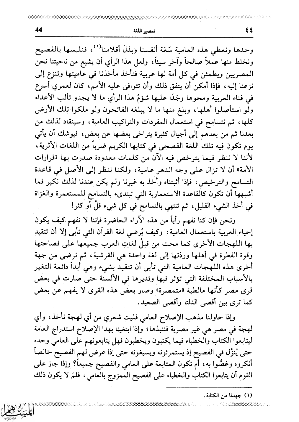 إحياء العربية باستعمال العامية، وكيف يُرضي لغة القرآن التي تأبى إلا أن تتقيد بها اللهجات الأخرى كما محت من قبلُ لغات العرب جميعها على فصاحتها وقوة الفطرة في أهلها وردتها إلى لغة واحدة هي القرشية، ثم نرضى من جهة أخرى هذه اللهجات العامية التي تأبى أن تتقيد بشيء وهي أبداً دائمة التغير بالأسباب المختلفة التي تؤثر فيها وتديرها في الألسنة حتى صارت في بعض قرى مصر كأنها مالطية "متمصرة" وصار بعض هذه القرى لا يفهم عن بعض كما ترى بين أقصى الدلتا وأقصى الصعيد.