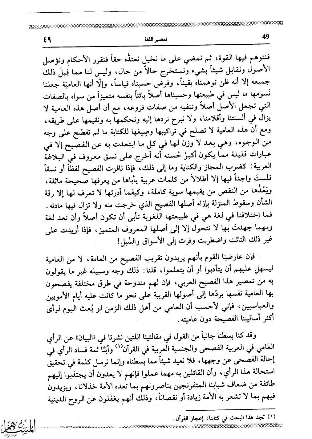 ليسهل عليهم أن يتأدبوا أو أن يتعلموا، قلنا: ذلك وجه وسبيله غير ما يقولون به من تمصير هذا الفصيح العربي، فإن لهم مندوحة في طرق مختلفة يفصحون بها العامية نفسها بردها إلى أصولها القريبة على نحو ما كانت عليه أيام الأمويين والعباسيين، فإني لأحسب أن العامي من أهل ذلك الزمن لو بُعث اليوم لرأى أكثر أساليبنا الفصيحة دون عاميته.