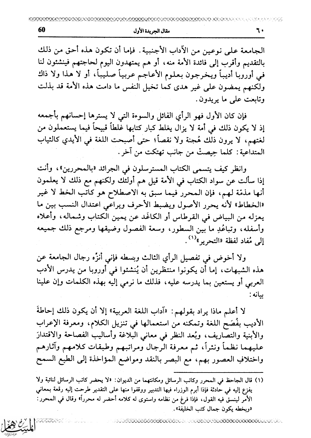 فإما أن تكون هذه أحق من ذلك بالتقديم وأقرب إلى فائدة الأمة منه، أو هم يمتهدون اليوم لحاجتهم فينشئون لنا في أوروبا أديْباً ويخرجون بعلوم الأعاجم عربياً صليباً، أو لا هذا ولا ذاك ولكنهم يمضون على غير هدى كما تخيل النفس ما دامت هذه الأمة قد بذلت وتابعت على ما يريدون.