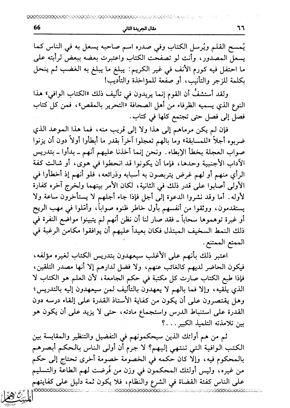 فيكون الحاضر لديهم كالغائب عنهم، ولا فضل لدارهم إلا أنها مصدر التلقين، فإذا طبع الكتاب صارت كل مكتبة في حكم الجامعة، لأن العلم هو الكتاب لا الذي يلقيه، وإلا فما بالهم لا يعهدون بالتأليف لمن سيعهدون إليه بالتدريس؛ وهل يقتصرون على أن يكون من كفاية الأستاذ القدرة على إلقاء درسه دون القدرة على استنباط الدرس واستجماع مادته، حتى لا يزيد على أن يكون هو بين تلامذته التلميذ الكبير. . .؟