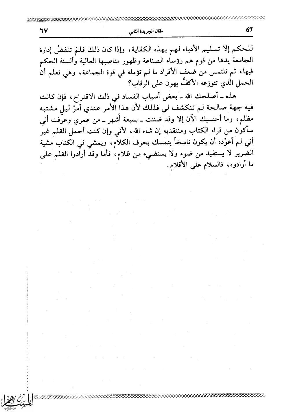 مظلم، وما أحتسبك الآن إلا وقد ضننت - بسبعة أَشهر - من عمري وعرفت أني سأكون من قراء الكتاب ومنتقديه إن شاء الله، لأني وإن كنت أحمل القلم غير أني لم أعوده أن يكون ناسخاً يتمسك بحرف الكلام، ويمشي في الكتاب مشية الضرير لا يستفيد من ضوء ولا يستضيء من ظلام، فأما وقد أرادوا القلم على ما أرادوه، فالسلام على الأقلام.