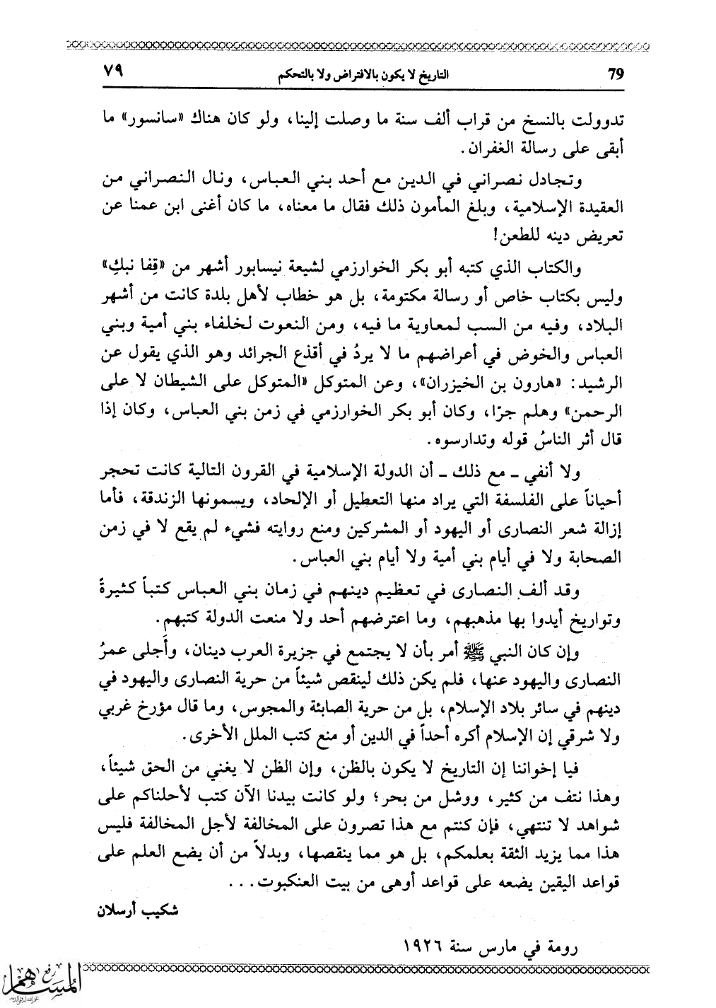 وإن كان النبي - صلى الله عليه وسلم - أمر بأن لا يجتمع في جزيرة العرب دينان، وأَجلى عمرُ النصارى واليهود عنها، فلم يكن ذلك لينقص شيئاً من حرية النصارى واليهود في دينهم في سائر بلاد الإسلام، بل من حرية الصابئة والمجوس، وما قال مؤرخ غربي ولا شرقي إن الإسلام أكره أحداً في الدين أو منع كتب الملل الأخرى.