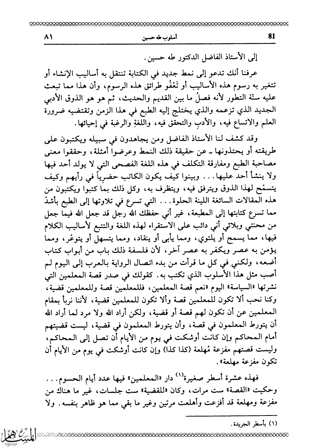 يتسمَّح لهذا الذوق ويترفق فيه، ويتظرف به، وكل ذلك بما كتبوا ويكتبون من هذه المقالات السائغة اللينة الحلوة. . . التي تسرع في تلاوتها إلى الطبع بأشد مما تسرع كتابتها إلى المطبعة، غير أني حفظك الله رجل قد جعل الله فيما جعل من محنتي وبلائي أني داثب على الاستقراء لهذه اللغة والتتبع لأساليب الكلام فيها، مما يسمح أو يلتوي، ومما يأبى أو ينقاد، ومما يتسهل أو يتوغر، ومما يؤمن به عصر ويكفر به عصر آخر، لأن فلسفة ذلك باب من أبواب كتاب أضعه، ولكني في كل ما قرأت من بدء اتصال الرواية بالعرب إلى اليوم لم أصب مثل هذا الأسلوب الذي تكتب به. كقولك في صدر قصة المعلمين التي نشرتها "السياسة" اليوم "نعم قصة المعلمين، فللمعلمين قصة وللمعلمين قضية، وكنا نحب ألا تكون للمعلمين قصة وألا تكون للمعلمين قضية، لأننا نربأ بمقام المعلمين عن أن تكون لهم قصة أو قضية، ولكن أراد الله ولا مرد لما أراد الله أن يتورط المعلمون في قصة، وأن يتورط المعلمون في قضية، ليست قضيتهم أمام المحاكم وإن كانت أوشكت في يوم من الأيام أن تصل إلى المحاكم.