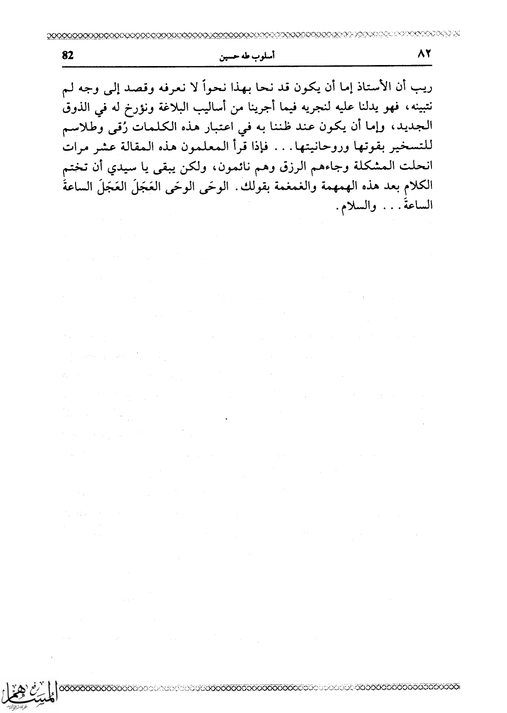 نتبينه، فهو يدلنا عليه لنجريه فيما أجرينا من أساليب البلاغة ونؤرخ له في الذوق الجديد، وإما أن يكون عند ظننا به في اعتبار هذه الكلمات رُقى وطلاسم للتسخير بقوتها وروحانيتها. . . فإذا قرأ المعلمون هذه المقالة عشر مرات انحلت المشكلة وجاءهم الرزق وهم نائمون، ولكن يبقى يا سيدي أن تختم الكلام بعد هذه الهمهمة والغمغمة بقولك.