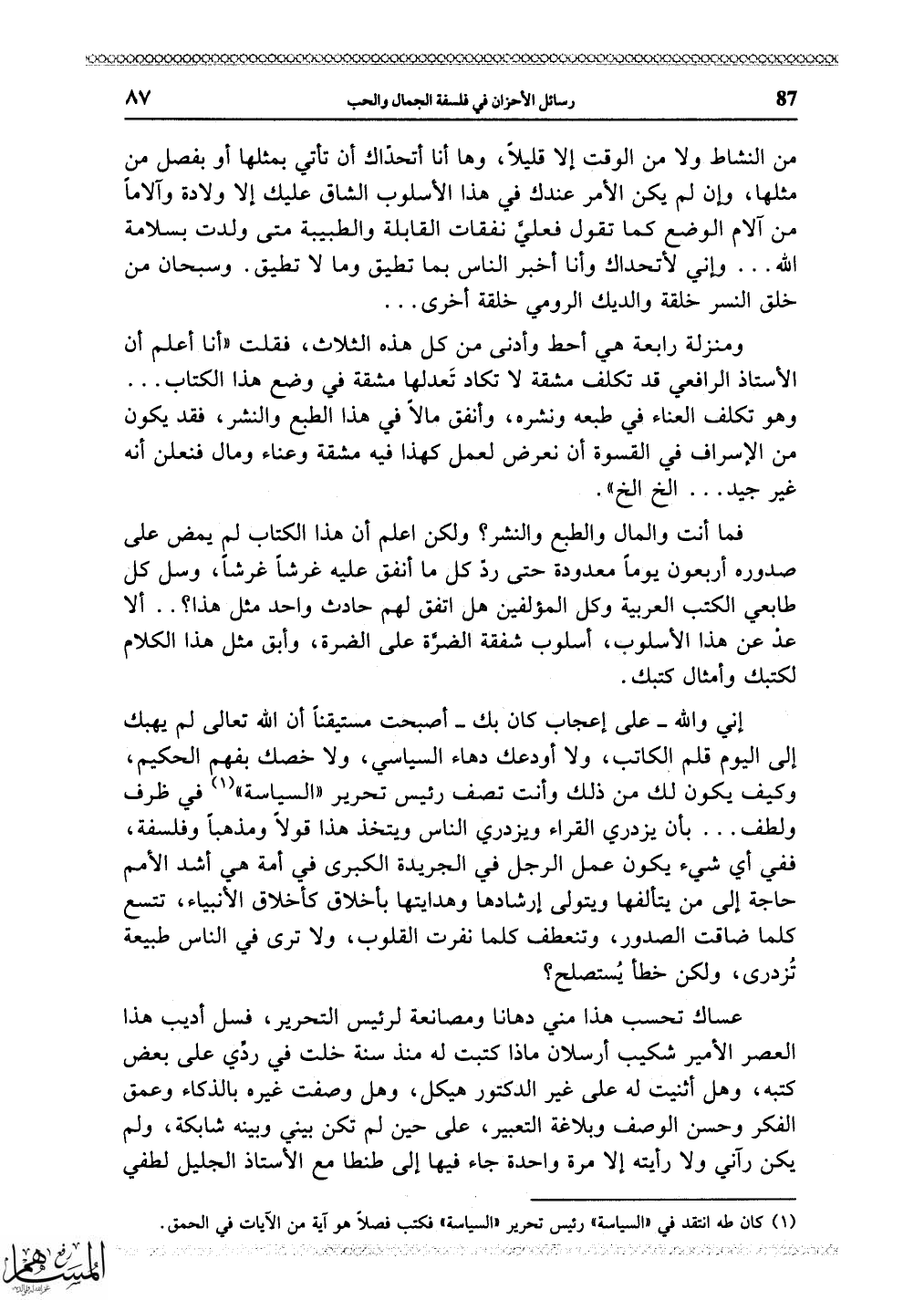 العصر الأمير شكيب أرسلان ماذا كتبت له منذ سنة خلت في ردِّي على بعض كتبه، وهل أثنيت له على غير الدكتور هيكل، وهل وصفت غيره بالذكاء وعمق الفكر وحسن الوصف وبلاغة التعبير، على حين لم تكن بيني وبينه شابكة، ولم يكن رآني ولا رأيته إلا مرة واحدة جاء فيها إلى طنطا مع الأستاذ الجليل لطفي