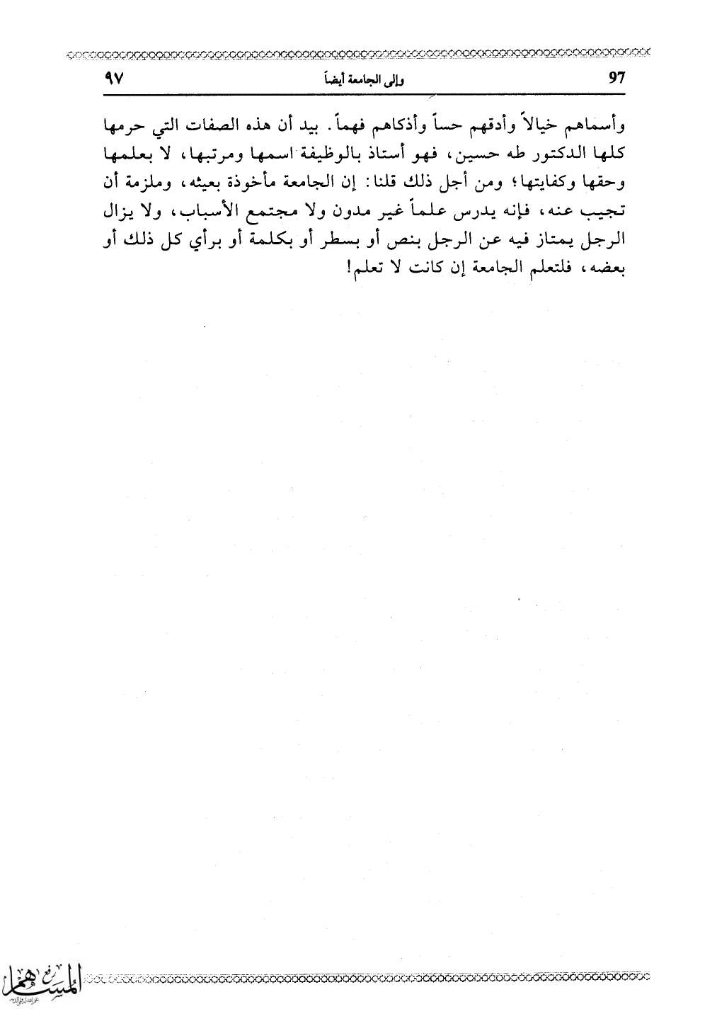 بيد أن هذه الصفات التي حرمها كلها الدكتور طه حسين، فهو أستاذ بالوظيفة اسمها ومرتبها، لا بعلمها وحقها وكفايتها.