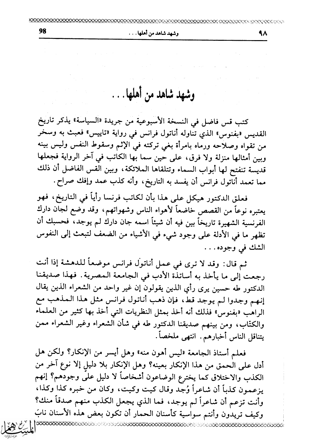 فهذا صديقنا الدكتور طه حسين يرى رأي الذين يقولون إن غير واحد من الشعراء الذين يقال إنهم وجدوا لم يوجد قط، فإن ذهب أناتول فرانس مثل هذا المذهب مع الراهب "بفنوس" فذلك أنه أخذ بمثل النظريات التي أخذ بها كثير من العلماء والكتاب، ومن بينهم صديقنا الدكتور طه في شأن الشعراء وغير الشعراء ممن يتناقل الناس أخبارهم. انتهى ملخصاً.