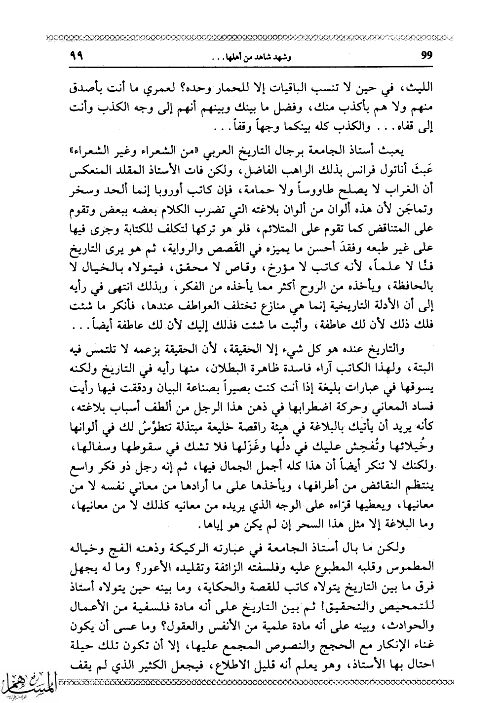عَبثَ أناتول فرانس بذلك الراهب الفاضل، ولكن فات الأستاذ المقلد المنعكس أن الغراب لا يصلح طاووساً ولا حمامة، فإن كاتب أوروبا إنما ألحد وسخر وتماجَن لأن هذه ألوان من ألوان بلاغته التي تضرب الكلام بعضه ببعض وتقوم على المتناقض كما تقوم على المتلائم، فلو هو تركها لتكلف للكتابة وجرى فيها على غير طبعه وفقدَ أحسن ما يميزه في القَصص والرواية، ثم هو يرى التاريخ فنا لا علماً، لأنه كاتب لا مؤرخ، وقاص لا محقق، فيتولاه بالخيال لا بالحافظة، ويأخذه من الروح أكثر مما يأخذه من الفكر، وبذلك انتهى في رأيه إلى أن الأدلة التاريخية إنما هي منازع تختلف العواطف عندها، فأنكر ما شئت فلك ذلك لأن لك عاطفة، وأثبت ما شئت فذلك إليك لأن لك عاطفة أيضاً. . .