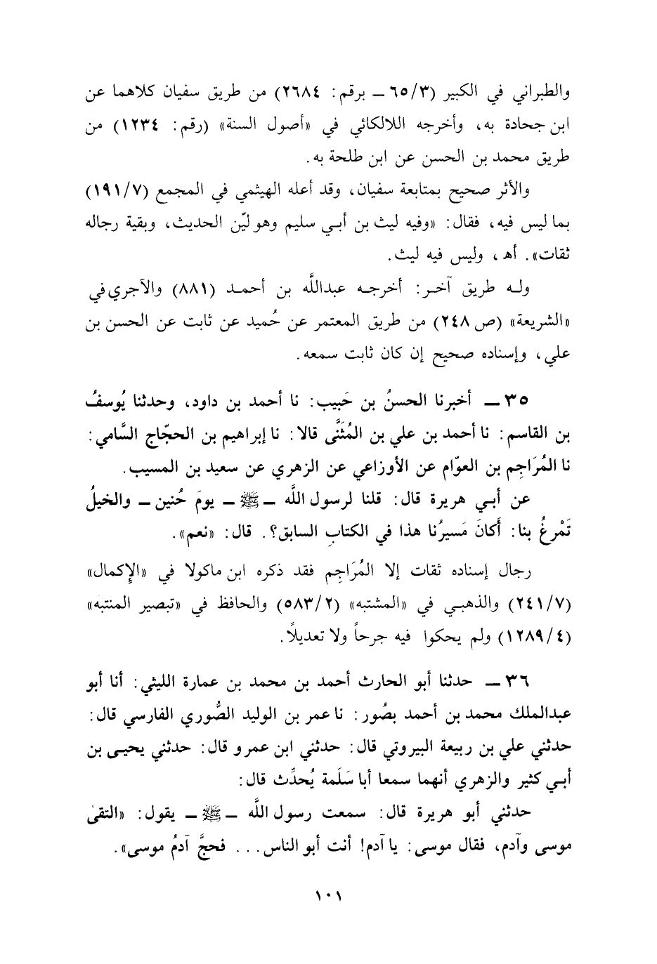 والطبراني في الكبير (3/ 65 - برقم: 2684) من طريق سفيان كلاهما عن ابن جحادة به، وأخرجه اللالكائي في "أصول السنة" (رقم: 1234) من طريق محمَّد بن الحسن عن ابن طلحة به.