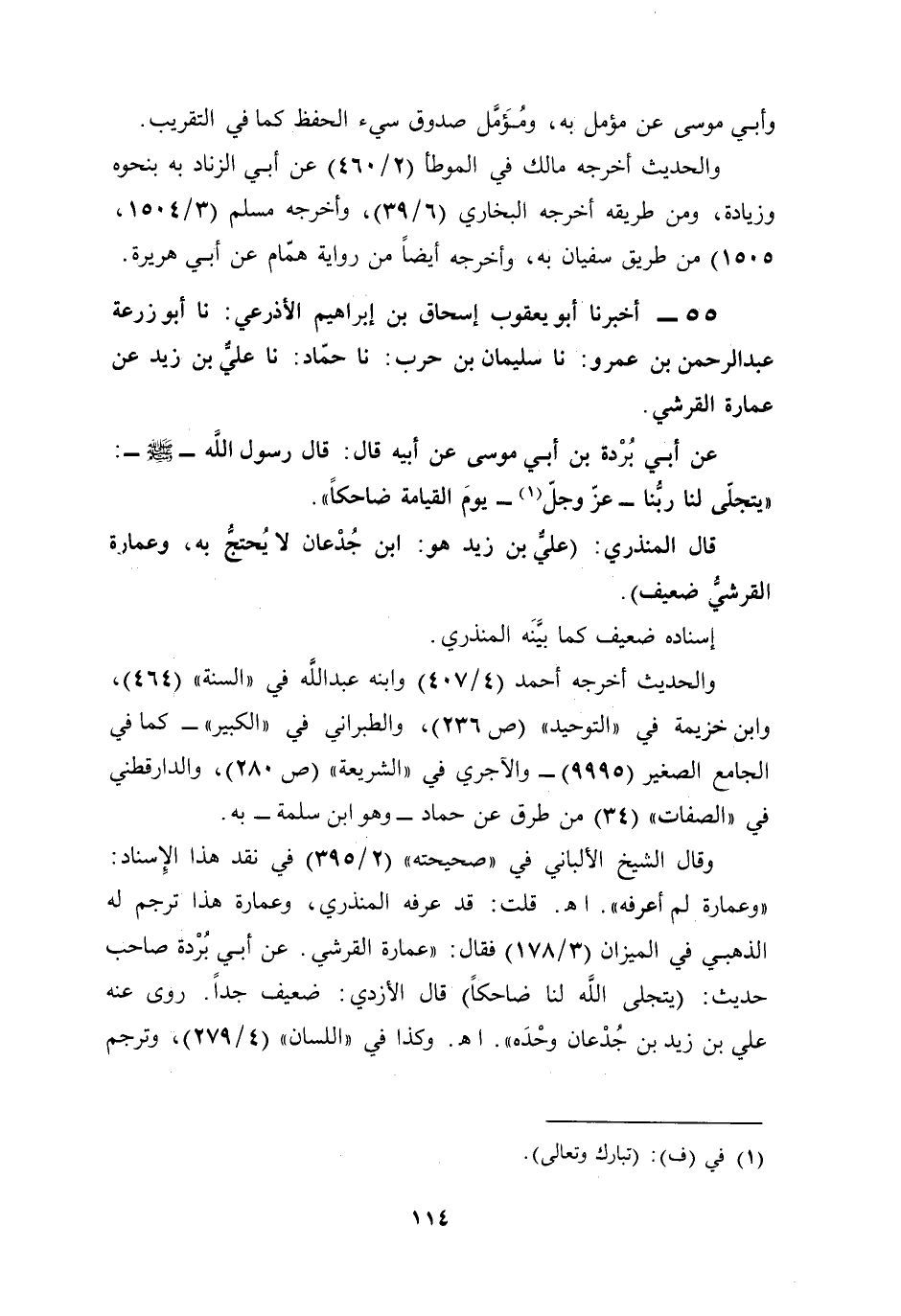 وقال الشيخ الألباني في "صحيحته" (2/ 395) في نقد هذا الإِسناد: "وعمارة لم أعرفه" أهـ. قلت: قد عرفه المنذري، وعمارة هذا ترجم له الذهبي في الميزان (3/ 178) فقال: "عمارة القرشي. عن أبي بُرْدة صاحب حديث: (يتجلى الله لنا ضاحكًا) قال الأزدي: ضعيف جدًا. روى عنه علي بن زيد بن جُدْعان وحْدَه". أهـ. وكذا في "اللسان" (4/ 279)، وترجم
