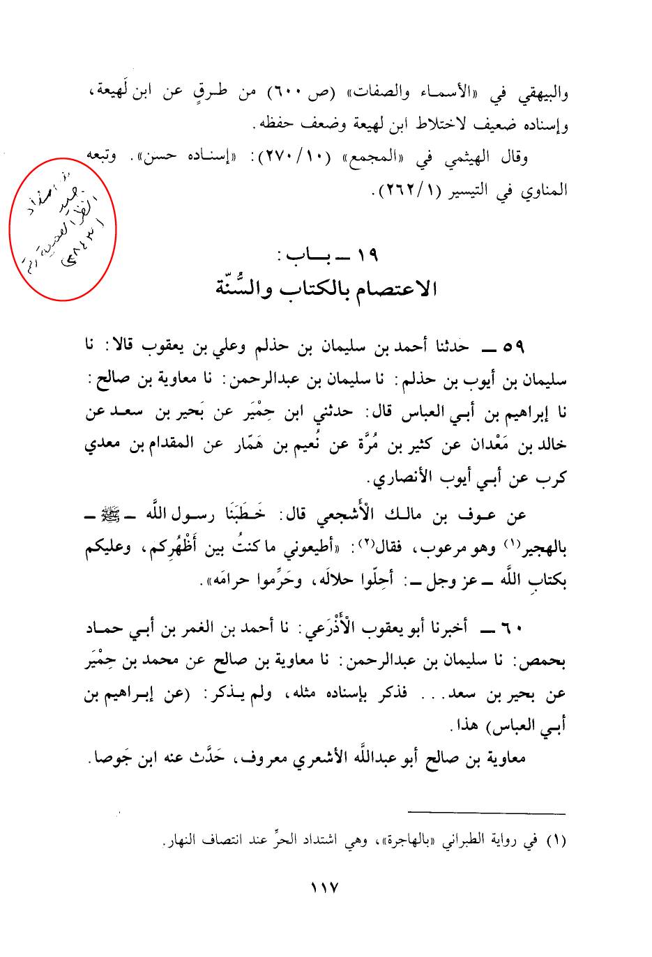 59 - حدثنا أحمد بن سليمان بن حذلم وعلي بن يعقوب قالا: نا سليمان بن أيوب بن حذلم: نا سليمان بن عبد الرحمن: نا معاوية بن صالح: نا إبراهيم بن أبي العباس قال: حدثني ابن حِمْيَر عن بَحير بن سعد عن خالد بن مَعْدان عن كثير بن مُرَّة عن نعيم بن هَمّار عن المقدام بن معدي كرب عن أبي أيوب الأنصاري.