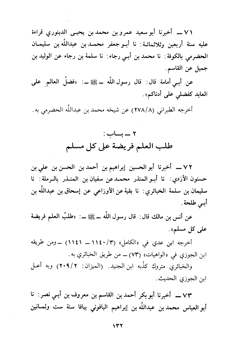 72 - أخبرنا أبو الحسين إبراهيم بن أحمد بن الحسن بن علي بن حسنون الأزدي: نا أبو المنذر محمد عن سفيان بن المنذر بالرملة: نا سليمان بن سلمة الخبائري: نا بقية عن الأوزاعي عن إسحاق بن عبد الله بن أبي طلحة.