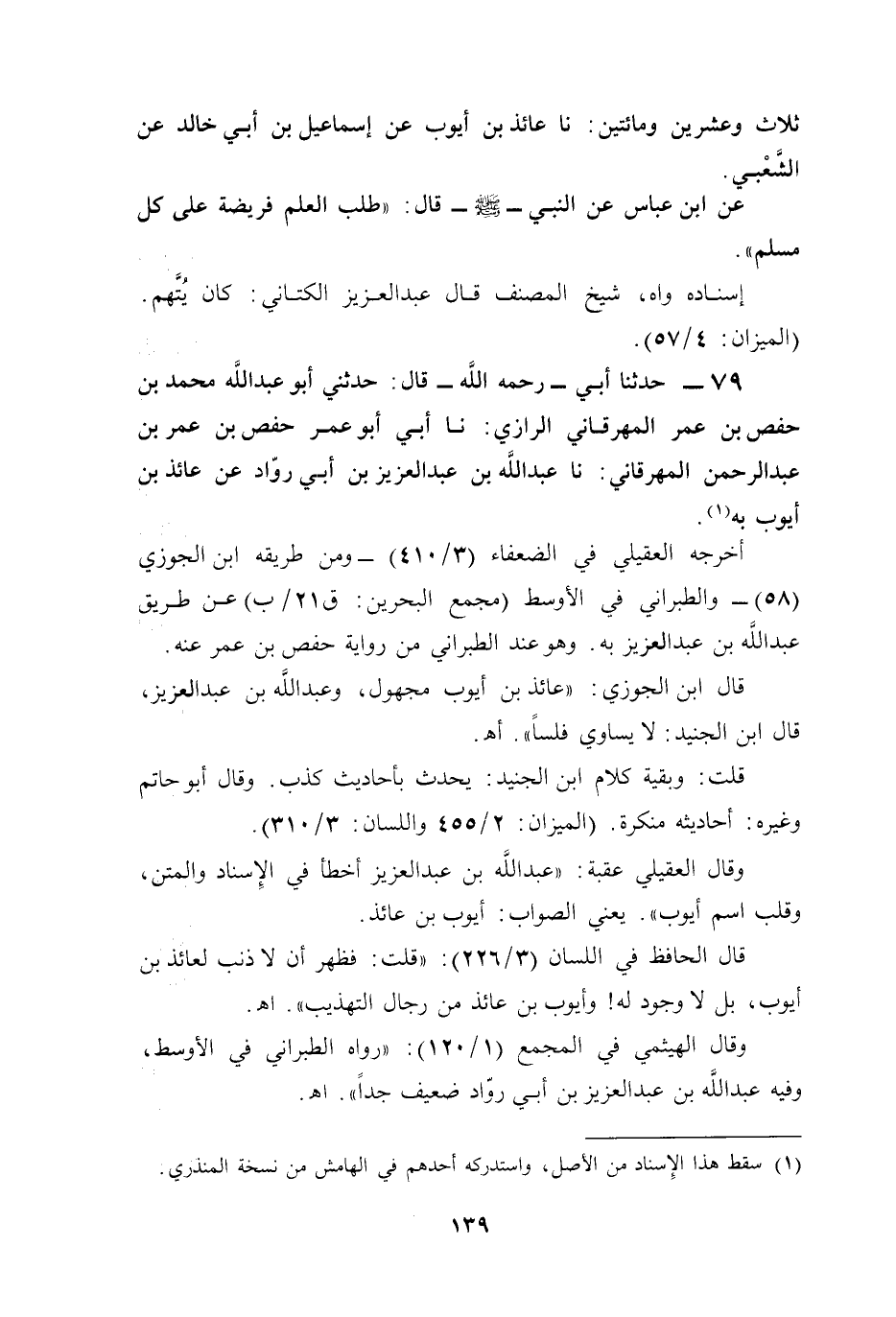 قال ابن الجوزي: "عائذ بن أيوب مجهول، وعبد الله بن عبد العزيز، قال ابن الجنيد: لا يساوي فلسًا". أهـ.